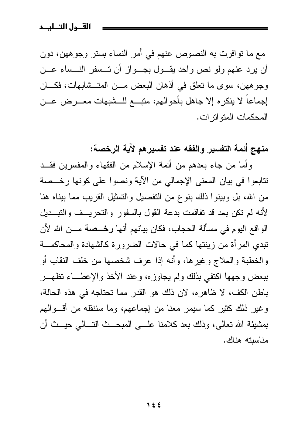 مع ما توافرت به النصوص عنهم في أمر النساء بستر وجوههن، دون أن يرد عنهم ولو نص واحد يقول بجواز أن تسفر النساء عن وجوههن، سوى ما تعلق في أذهان البعض من المتشابهات، فكان إجماعاً لا ينكره إلا جاهل بأحوالهم، متبع للشبهات معرض عن المحكمات المتواترات.