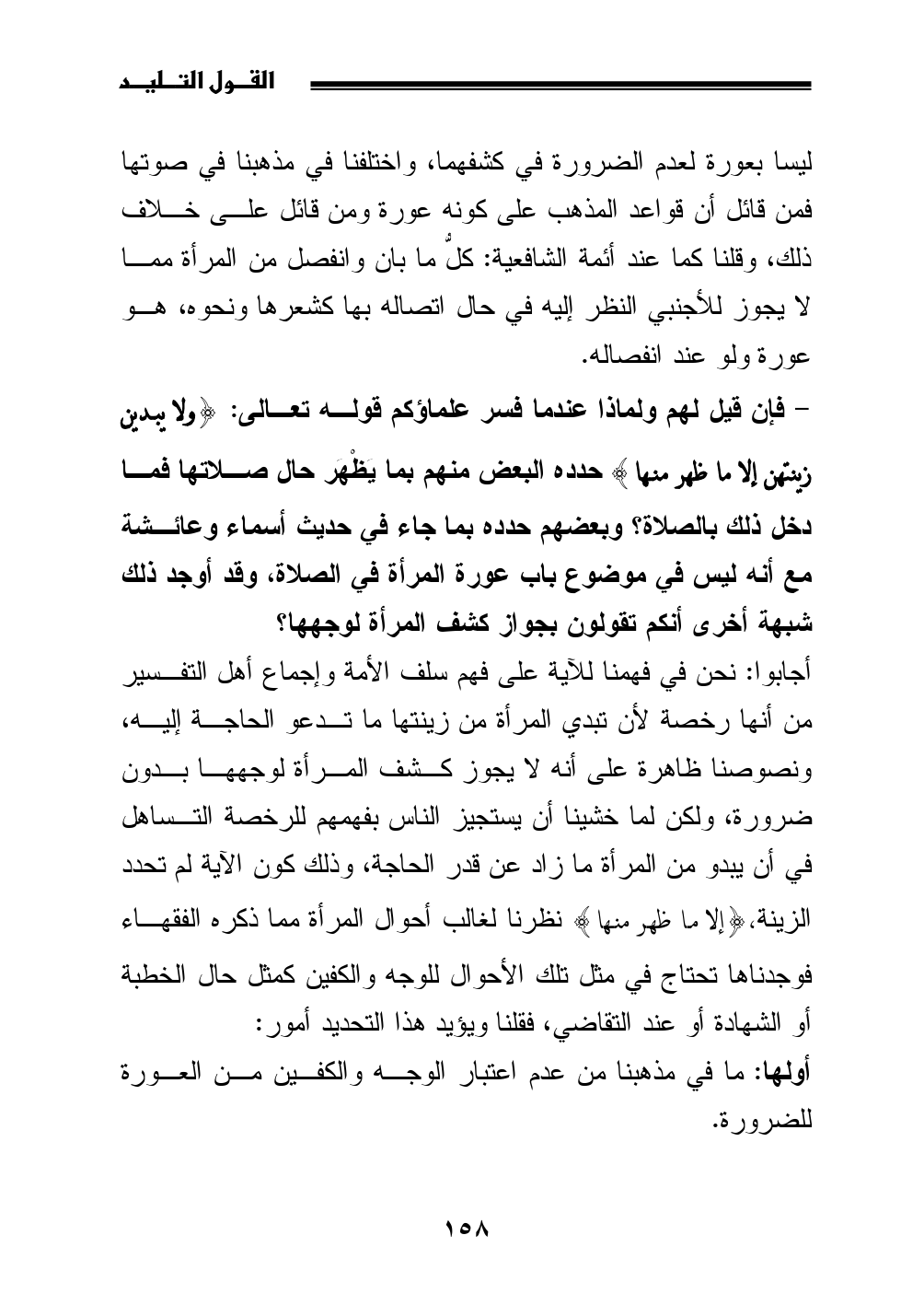 - فإن قيل لهم ولماذا عندما فسر علماؤكم قوله تعالى: {ولا يبدين زينتهن إلا ما ظهر منها} حدده البعض منهم بما يَظْهَر حال صلاتها فما دخل ذلك بالصلاة؟ وبعضهم حدده بما جاء في حديث أسماء وعائشة مع أنه ليس في موضوع باب عورة المرأة في الصلاة، وقد أوجد ذلك شبهة أخرى أنكم تقولون بجواز كشف المرأة لوجهها؟