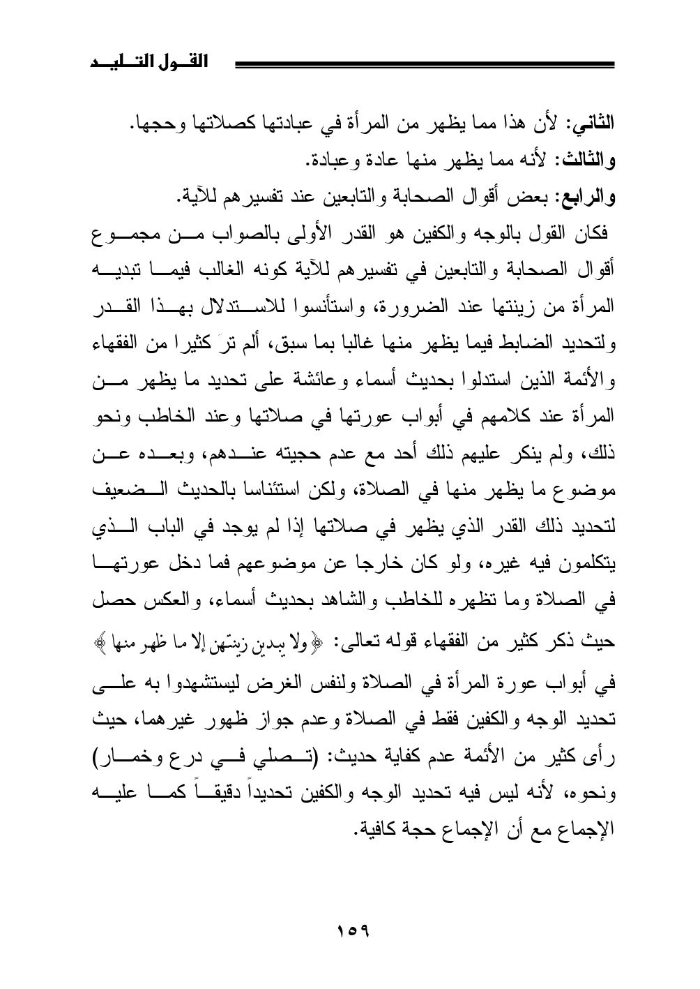 فكان القول بالوجه والكفين هو القدر الأولى بالصواب من مجموع أقوال الصحابة والتابعين في تفسيرهم للآية كونه الغالب فيما تبديه المرأة من زينتها عند الضرورة، واستأنسوا للاستدلال بهذا القدر ولتحديد الضابط فيما يظهر منها غالبا بما سبق، ألم ترَ كثيرا من الفقهاء والأئمة الذين استدلوا بحديث أسماء وعائشة على تحديد ما يظهر من المرأة عند كلامهم في أبواب عورتها في صلاتها وعند الخاطب ونحو ذلك، ولم ينكر عليهم ذلك أحد مع عدم حجيته عندهم، وبعده عن موضوع ما يظهر منها في الصلاة، ولكن استئناسا بالحديث الضعيف لتحديد ذلك القدر الذي يظهر في صلاتها إذا لم يوجد في الباب الذي يتكلمون فيه غيره، ولو كان خارجا عن موضوعهم فما دخل عورتها في الصلاة وما تظهره للخاطب والشاهد بحديث أسماء، والعكس حصل حيث ذكر كثير من الفقهاء قوله تعالى: {ولا يبدين زينتهن إلا ما ظهر منها} في أبواب عورة المرأة في الصلاة ولنفس الغرض ليستشهدوا به على تحديد الوجه والكفين فقط في الصلاة وعدم جواز ظهور غيرهما، حيث رأى كثير من الأئمة عدم كفاية حديث: (تصلي في درع وخمار) ونحوه، لأنه ليس فيه تحديد الوجه والكفين تحديداً دقيقاً كما عليه الإجماع مع أن الإجماع حجة كافية.