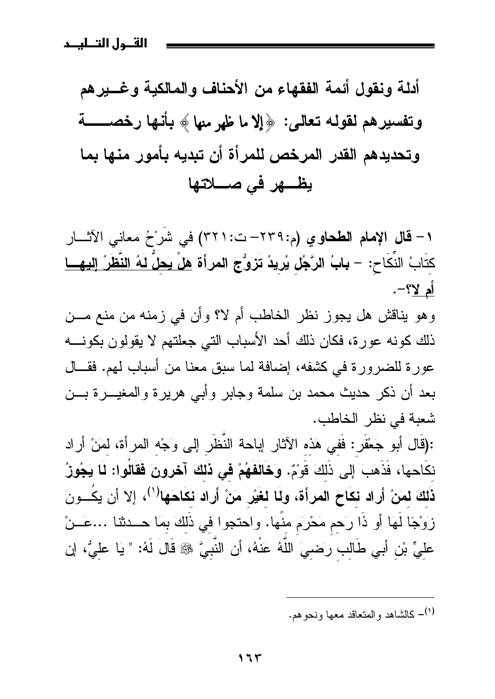 1 - قال الإمام الطحاوي (م: 239 - ت: 321) في شَرْحُ معاني الآثار كِتَابُ النِّكَاحِ: - بَابُ الرَّجُلِ يُرِيدُ تَزَوُّجَ المرأة هَلْ يَحِلُّ لَهُ النَّظَرُ إليها أم لا؟ -.