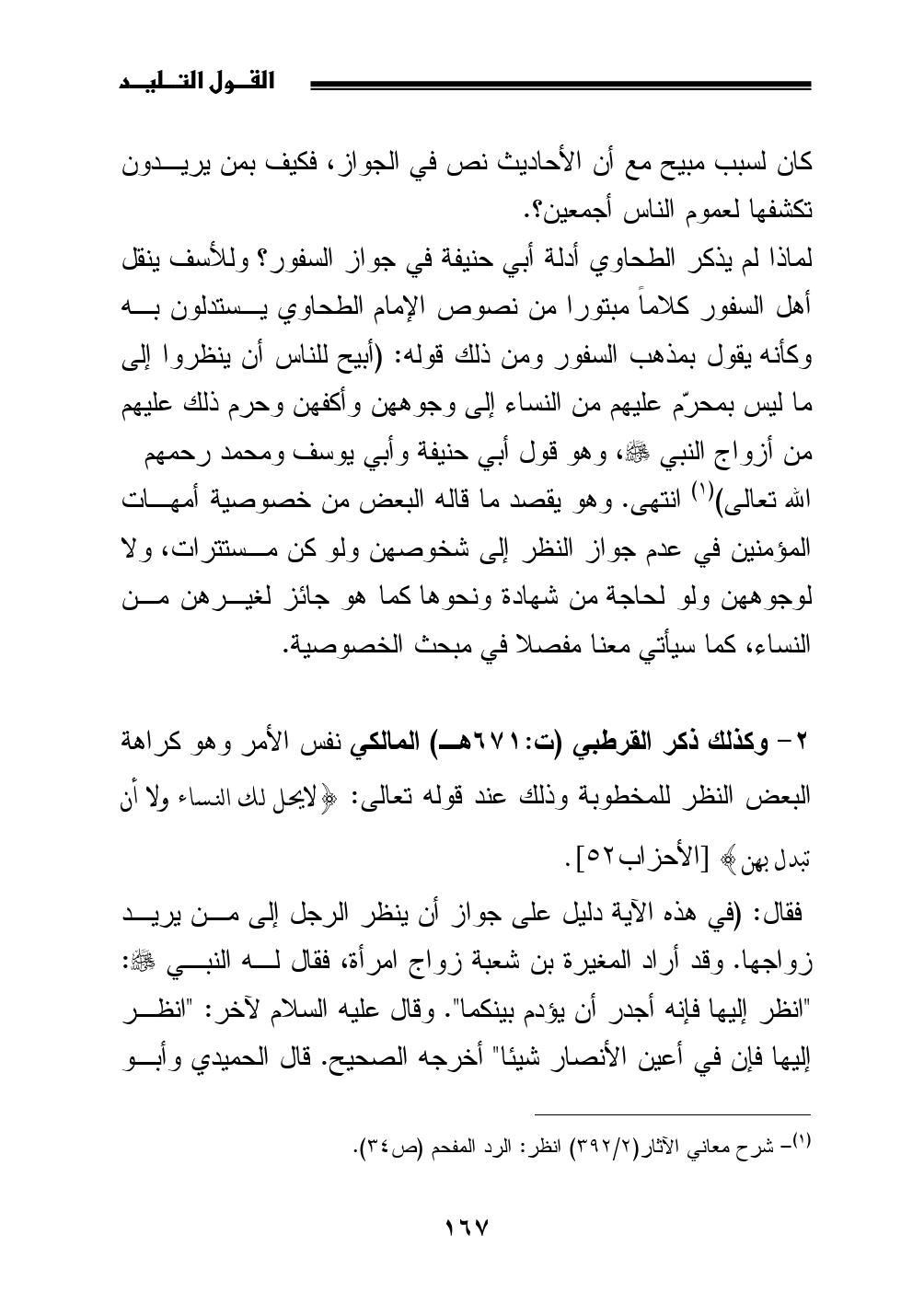لماذا لم يذكر الطحاوي أدلة أبي حنيفة في جواز السفور؟ وللأسف ينقل أهل السفور كلاماً مبتورا من نصوص الإمام الطحاوي يستدلون به وكأنه يقول بمذهب السفور ومن ذلك قوله: (أبيح للناس أن ينظروا إلى ما ليس بمحرّم عليهم من النساء إلى وجوههن وأكفهن وحرم ذلك عليهم من أزواج النبي - صلى الله عليه وسلم -، وهو قول أبي حنيفة وأبي يوسف ومحمد رحمهم الله تعالى) (¬1) انتهى. وهو يقصد ما قاله البعض من خصوصية أمهات المؤمنين في عدم جواز النظر إلى شخوصهن ولو كن مستترات، ولا لوجوههن ولو لحاجة من شهادة ونحوها كما هو جائز لغيرهن من النساء، كما سيأتي معنا مفصلا في مبحث الخصوصية.