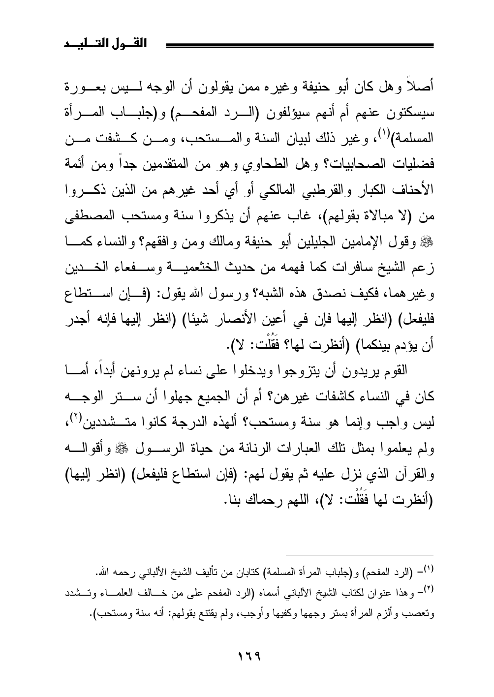 (¬2) وهذا عنوان لكتاب الشيخ الألباني أسماه (الرد المفحم على من خالف العلماء وتشدد وتعصب وألزم المرأة بستر وجهها وكفيها وأوجب، ولم يقتنع بقولهم: أنه سنة ومستحب).