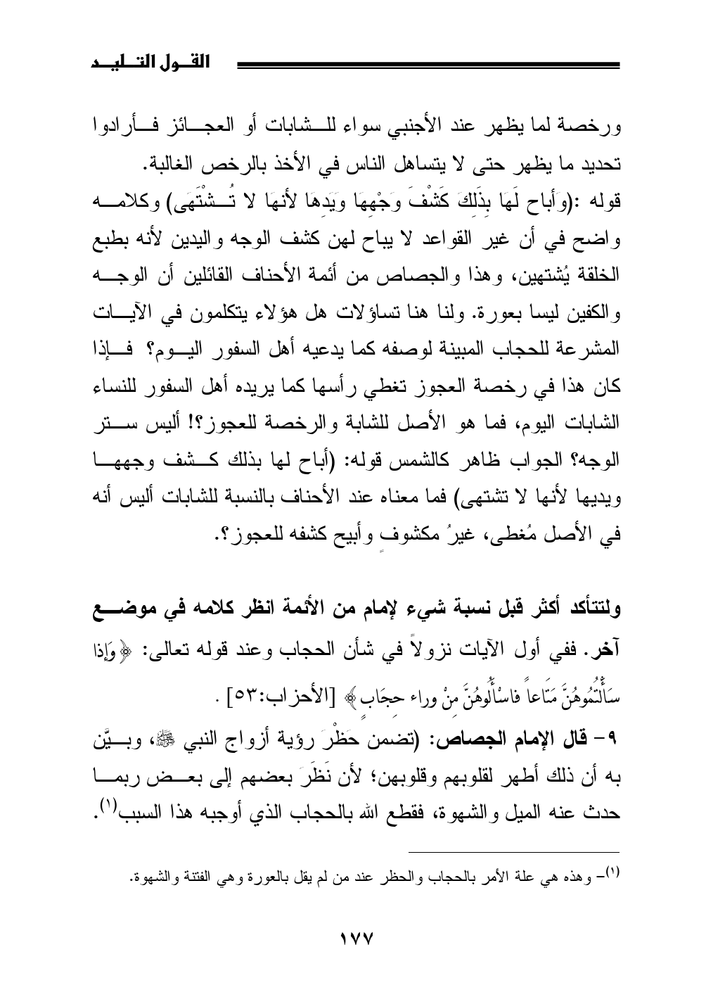 ولتتأكد أكثر قبل نسبة شيء لإمام من الأئمة انظر كلامه في موضع آخر. ففي أول الآيات نزولاً في شأن الحجاب وعند قوله تعالى: {وَإذا سَأَلْتُمُوهُنَّ مَتَاعاً فاسْأَلُوهُنَّ مِنْ وراء حِجَابٍ} [الأحزاب: 53].