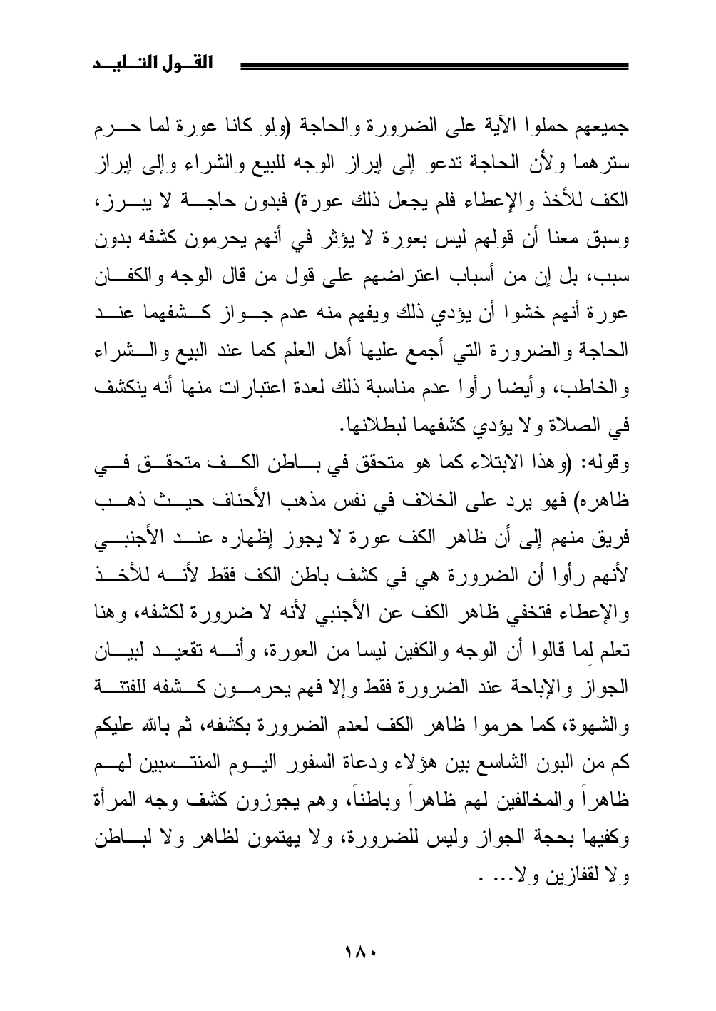 وقوله: (وهذا الابتلاء كما هو متحقق في باطن الكف متحقق في ظاهره) فهو يرد على الخلاف في نفس مذهب الأحناف حيث ذهب فريق منهم إلى أن ظاهر الكف عورة لا يجوز إظهاره عند الأجنبي لأنهم رأوا أن الضرورة هي في كشف باطن الكف فقط لأنه للأخذ والإعطاء فتخفي ظاهر الكف عن الأجنبي لأنه لا ضرورة لكشفه، وهنا تعلم لِما قالوا أن الوجه والكفين ليسا من العورة، وأنه تقعيد لبيان الجواز والإباحة عند الضرورة فقط وإلا فهم يحرمون كشفه للفتنة والشهوة، كما حرموا ظاهر الكف لعدم الضرورة بكشفه، ثم بالله عليكم كم من البون الشاسع بين هؤلاء ودعاة السفور اليوم المنتسبين لهم ظاهراً والمخالفين لهم ظاهراً وباطناً، وهم يجوزون كشف وجه المرأة وكفيها بحجة الجواز وليس للضرورة، ولا يهتمون لظاهر ولا لباطن ولا لقفازين ولا ... .