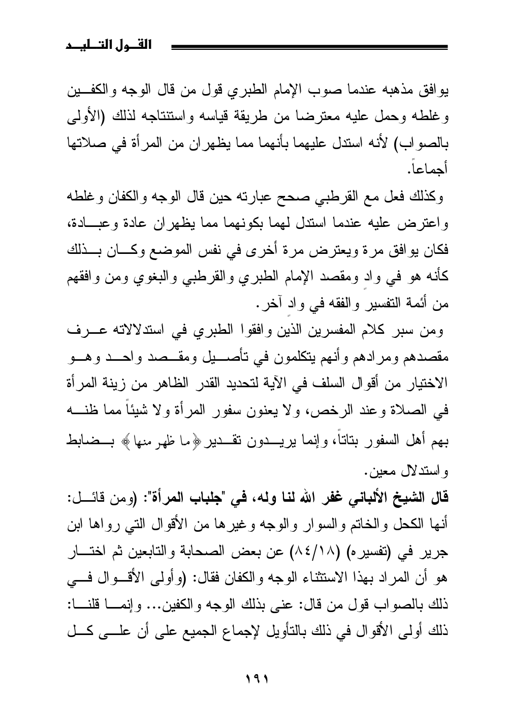 ومن سبر كلام المفسرين الذين وافقوا الطبري في استدلالاته عرف مقصدهم ومرادهم وأنهم يتكلمون في تأصيل ومقصد واحد وهو الاختيار من أقوال السلف في الآية لتحديد القدر الظاهر من زينة المرأة في الصلاة وعند الرخص، ولا يعنون سفور المرأة ولا شيئاً مما ظنه بهم أهل السفور بتاتاً، وإنما يريدون تقدير? ما ظهر منها} بضابط واستدلال معين.
