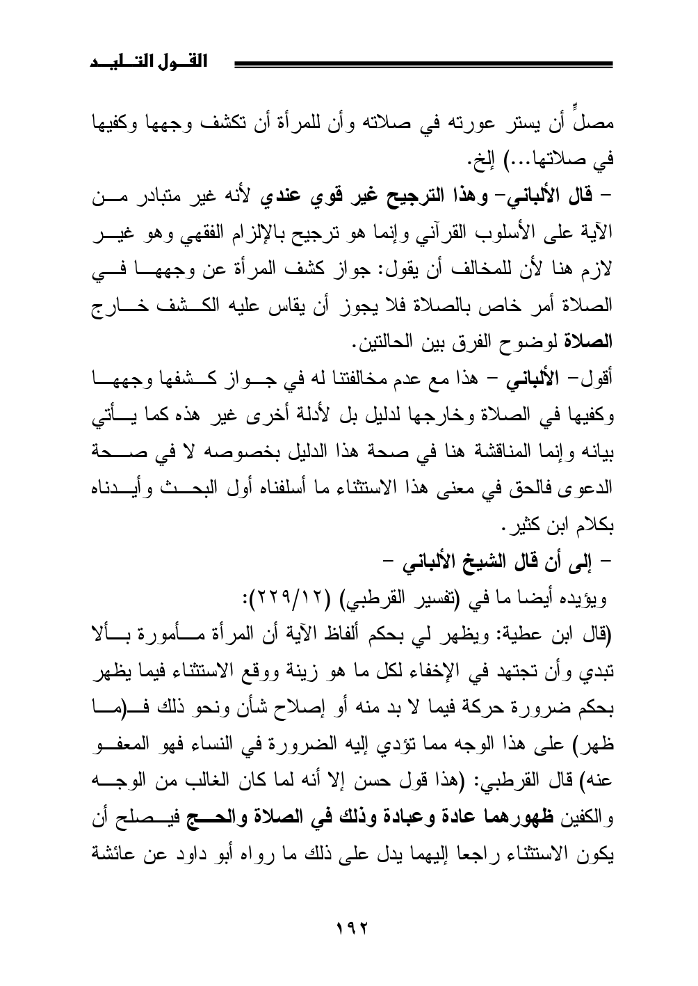 أقول- الألباني - هذا مع عدم مخالفتنا له في جواز كشفها وجهها وكفيها في الصلاة وخارجها لدليل بل لأدلة أخرى غير هذه كما يأتي بيانه وإنما المناقشة هنا في صحة هذا الدليل بخصوصه لا في صحة الدعوى فالحق في معنى هذا الاستثناء ما أسلفناه أول البحث وأيدناه بكلام ابن كثير.