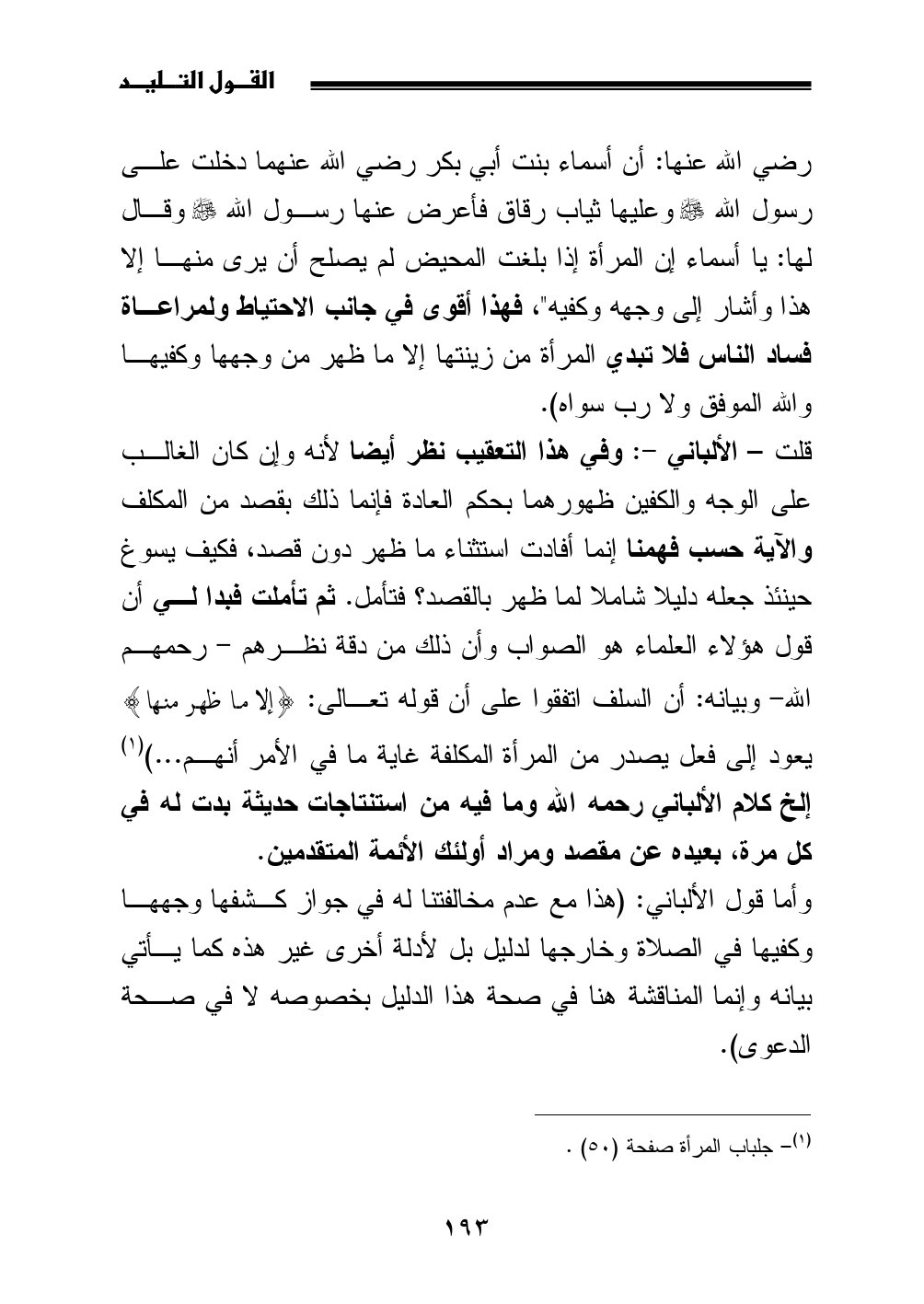 قلت - الألباني -: وفي هذا التعقيب نظر أيضا لأنه وإن كان الغالب على الوجه والكفين ظهورهما بحكم العادة فإنما ذلك بقصد من المكلف والآية حسب فهمنا إنما أفادت استثناء ما ظهر دون قصد، فكيف يسوغ حينئذ جعله دليلا شاملا لما ظهر بالقصد؟ فتأمل. ثم تأملت فبدا لي أن قول هؤلاء العلماء هو الصواب وأن ذلك من دقة نظرهم - رحمهم الله- وبيانه: أن السلف اتفقوا على أن قوله تعالى: {إلا ما ظهر منها} يعود إلى فعل يصدر من المرأة المكلفة غاية ما في الأمر أنهم ... ) (¬1) إلخ كلام الألباني رحمه الله وما فيه من استنتاجات حديثة بدت له في كل مرة، بعيده عن مقصد ومراد أولئك الأئمة المتقدمين.