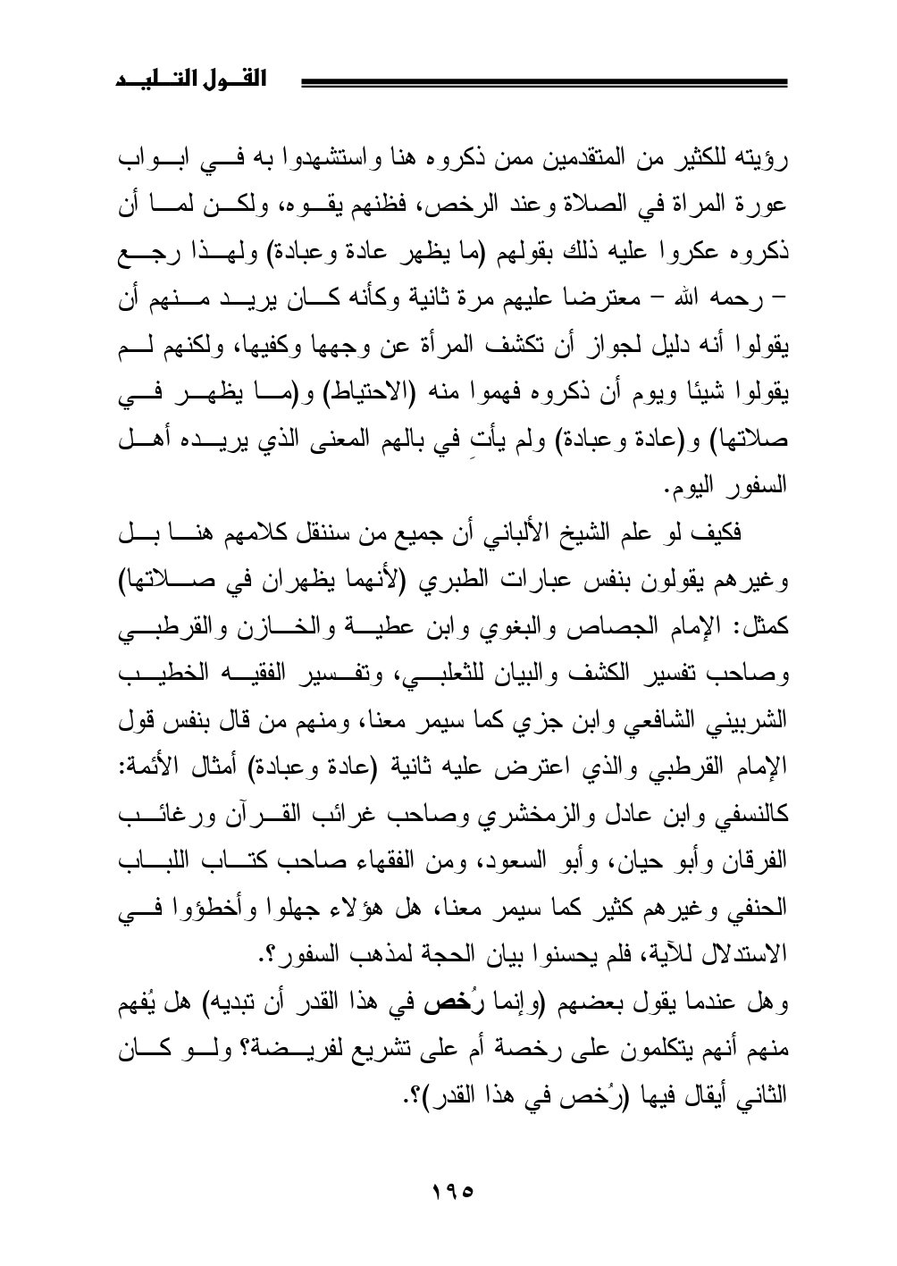 فكيف لو علم الشيخ الألباني أن جميع من سننقل كلامهم هنا بل وغيرهم يقولون بنفس عبارات الطبري (لأنهما يظهران في صلاتها) كمثل: الإمام الجصاص والبغوي وابن عطية والخازن والقرطبي وصاحب تفسير الكشف والبيان للثعلبي، وتفسير الفقيه الخطيب الشربيني الشافعي وابن جزي كما سيمر معنا، ومنهم من قال بنفس قول الإمام القرطبي والذي اعترض عليه ثانية (عادة وعبادة) أمثال الأئمة: كالنسفي وابن عادل والزمخشري وصاحب غرائب القرآن ورغائب الفرقان وأبو حيان، وأبو السعود، ومن الفقهاء صاحب كتاب اللباب الحنفي وغيرهم كثير كما سيمر معنا، هل هؤلاء جهلوا وأخطؤوا في الاستدلال للآية، فلم يحسنوا بيان الحجة لمذهب السفور؟ .