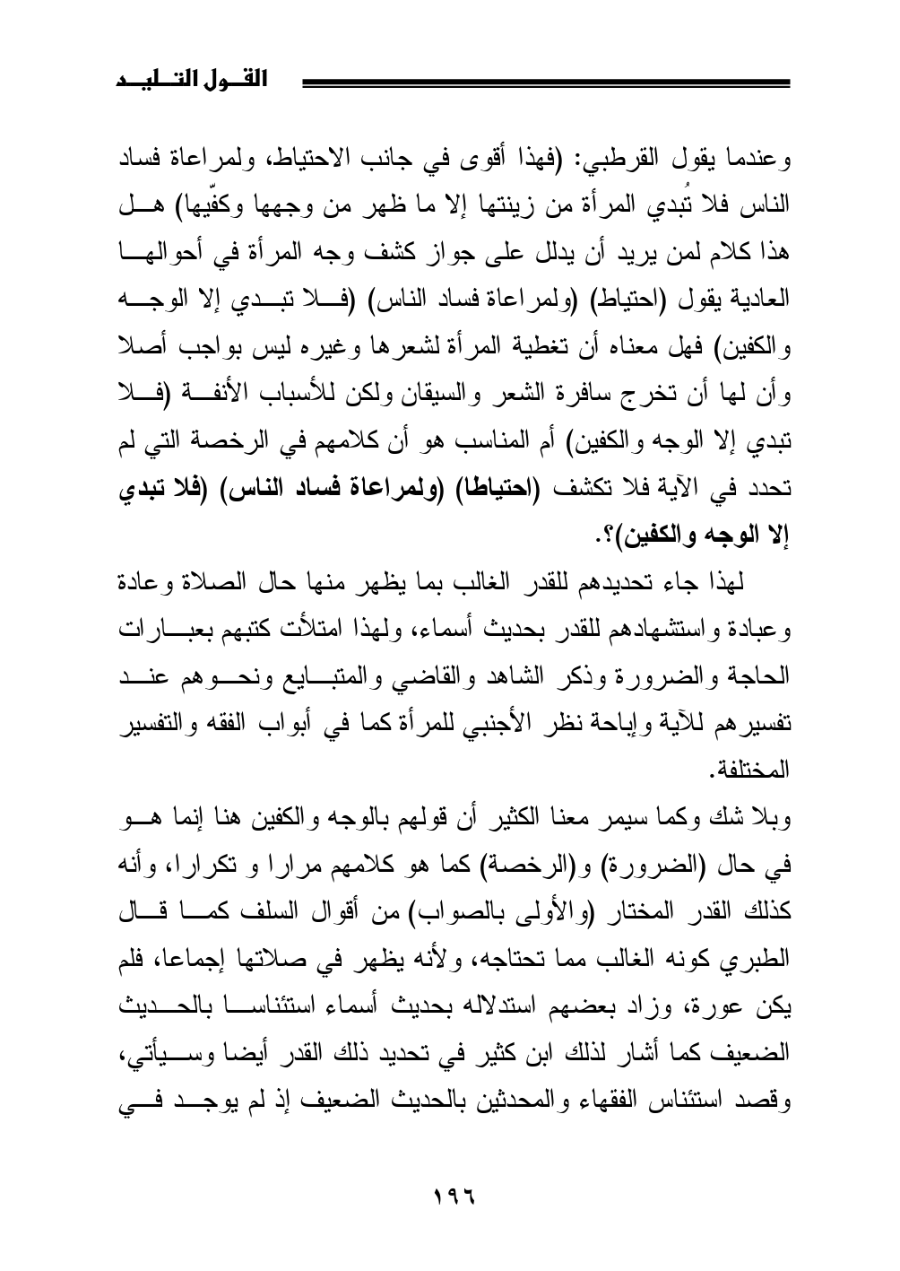 لهذا جاء تحديدهم للقدر الغالب بما يظهر منها حال الصلاة وعادة وعبادة واستشهادهم للقدر بحديث أسماء، ولهذا امتلأت كتبهم بعبارات الحاجة والضرورة وذكر الشاهد والقاضي والمتبايع ونحوهم عند تفسيرهم للآية وإباحة نظر الأجنبي للمرأة كما في أبواب الفقه والتفسير المختلفة.