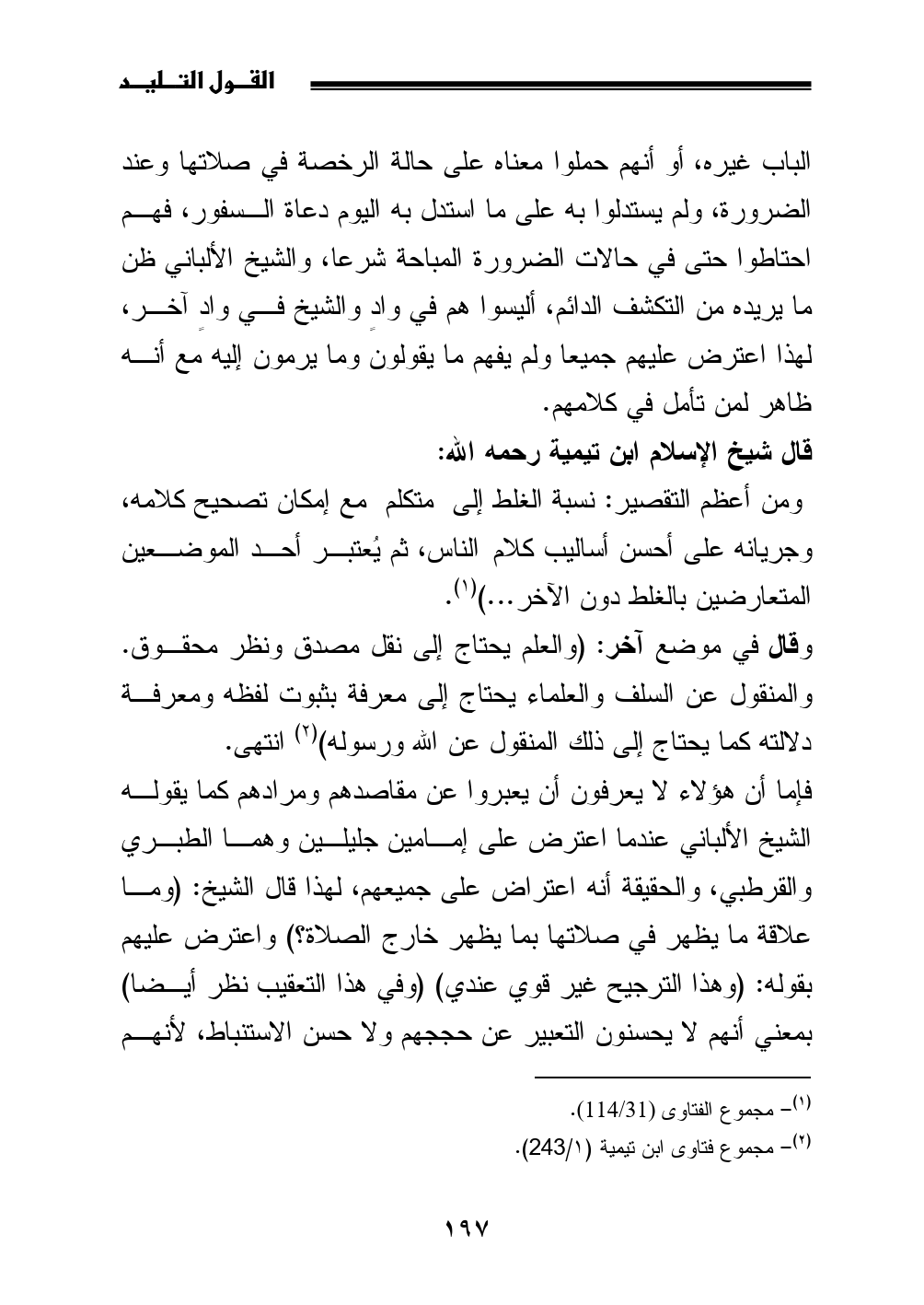 الباب غيره، أو أنهم حملوا معناه على حالة الرخصة في صلاتها وعند الضرورة، ولم يستدلوا به على ما استدل به اليوم دعاة السفور، فهم احتاطوا حتى في حالات الضرورة المباحة شرعا، والشيخ الألباني ظن ما يريده من التكشف الدائم، أليسوا هم في وادٍ والشيخ في وادٍ آخر، لهذا اعترض عليهم جميعا ولم يفهم ما يقولون وما يرمون إليه مع أنه ظاهر لمن تأمل في كلامهم.