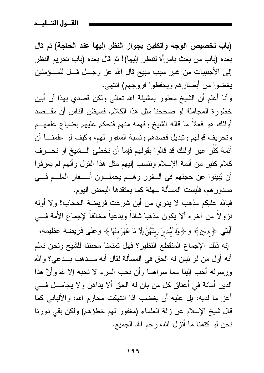 وأنا أعلم أن الشيخ معذور بمشيئة الله تعالى ولكن قصدي بهذا أن أبين خطورة المجاملة لو صححنا مثل هذا الكلام، فسيظن الناس أن مقصد أولئك هو فعلاً ما قاله الشيخ وفهمه منهم فنحكم عليهم بضياع علمهم وتحريف قولهم وتبديل قصدهم ونسبة السفور لهم، وكيف لو علمنا أن أئمة كُثُر غير أولئك قد قالوا بقولهم فإما أن نخطئ الشيخ أو نحرف كلام كثير من أئمة الإسلام وننسب إليهم مثل هذا القول وأنهم لم يعرفوا أن يُبينوا عن حجتهم في السفور وهم يحملون أسفار العلم في صدورهم، فليست المسألة سهلة كما يعتقدها البعض اليوم.