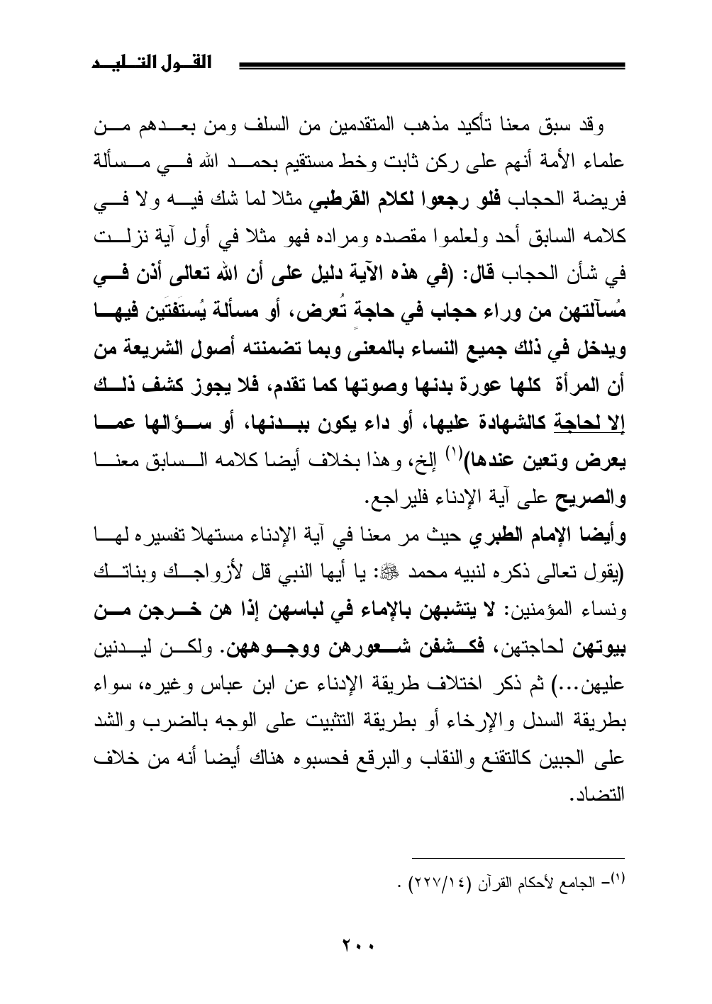 وقد سبق معنا تأكيد مذهب المتقدمين من السلف ومن بعدهم من علماء الأمة أنهم على ركن ثابت وخط مستقيم بحمد الله في مسألة فريضة الحجاب فلو رجعوا لكلام القرطبي مثلا لما شك فيه ولا في كلامه السابق أحد ولعلموا مقصده ومراده فهو مثلا في أول آية نزلت في شأن الحجاب قال: (في هذه الآية دليل على أن الله تعالى أذن في مُسآلتهن من وراء حجاب في حاجةٍ تُعرض، أو مسألة يُستَفتَين فيها ويدخل في ذلك جميع النساء بالمعنى وبما تضمنته أصول الشريعة من أن المرأة كلها عورة بدنها وصوتها كما تقدم، فلا يجوز كشف ذلك إلا لحاجة كالشهادة عليها، أو داء يكون ببدنها، أو سؤالها عما يعرض وتعين عندها) (¬1) إلخ، وهذا بخلاف أيضا كلامه السابق معنا والصريح على آية الإدناء فليراجع.