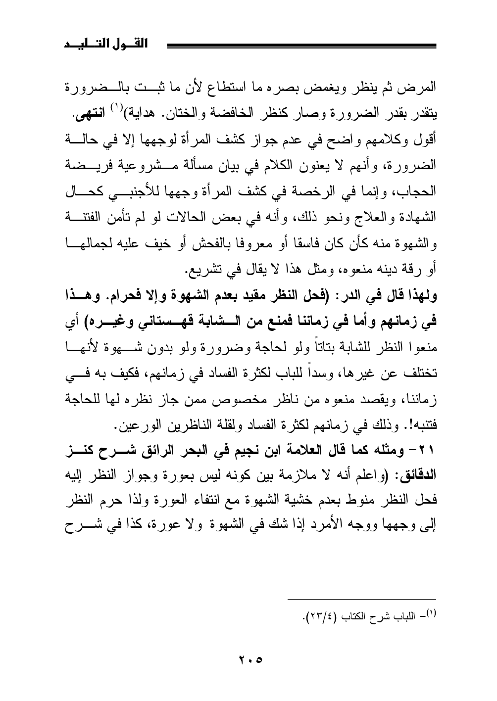 21 - ومثله كما قال العلامة ابن نجيم في البحر الرائق شرح كنز الدقائق: (واعلم أنه لا ملازمة بين كونه ليس بعورة وجواز النظر إليه فحل النظر منوط بعدم خشية الشهوة مع انتفاء العورة ولذا حرم النظر إلى وجهها ووجه الأمرد إذا شك في الشهوة ولا عورة، كذا في شرح