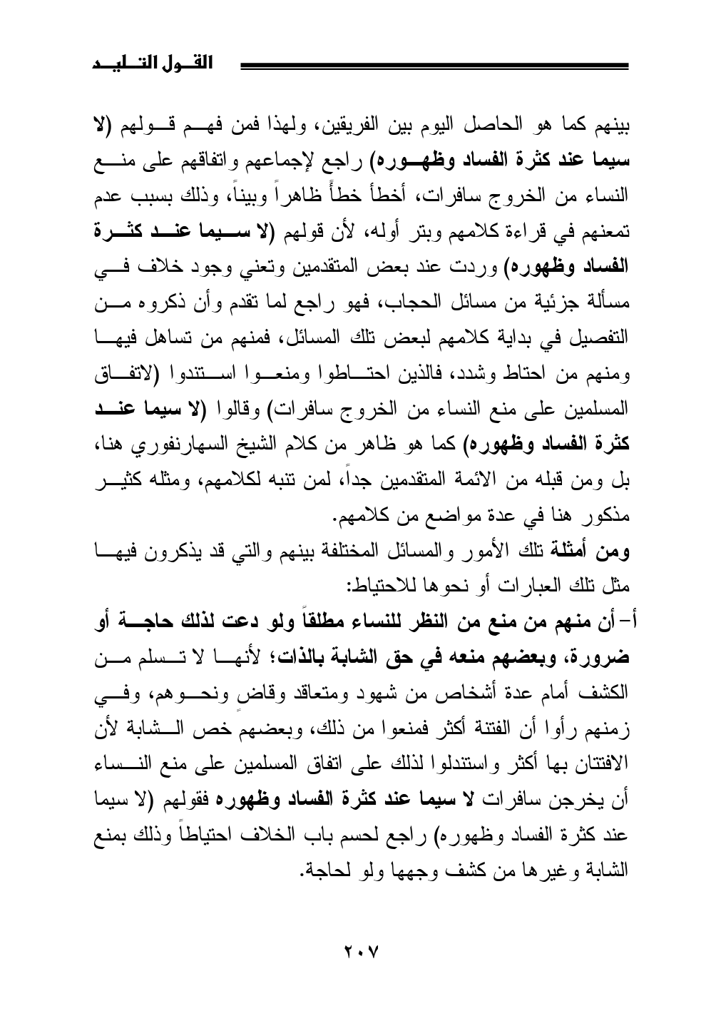 بينهم كما هو الحاصل اليوم بين الفريقين، ولهذا فمن فهم قولهم (لا سيما عند كثرة الفساد وظهوره) راجع لإجماعهم واتفاقهم على منع النساء من الخروج سافرات، أخطأ خطأً ظاهراً وبيناً، وذلك بسبب عدم تمعنهم في قراءة كلامهم وبتر أوله، لأن قولهم (لا سيما عند كثرة الفساد وظهوره) وردت عند بعض المتقدمين وتعني وجود خلاف في مسألة جزئية من مسائل الحجاب، فهو راجع لما تقدم وأن ذكروه من التفصيل في بداية كلامهم لبعض تلك المسائل، فمنهم من تساهل فيها ومنهم من احتاط وشدد، فالذين احتاطوا ومنعوا استندوا (لاتفاق المسلمين على منع النساء من الخروج سافرات) وقالوا (لا سيما عند كثرة الفساد وظهوره) كما هو ظاهر من كلام الشيخ السهارنفوري هنا، بل ومن قبله من الائمة المتقدمين جداً، لمن تنبه لكلامهم، ومثله كثير مذكور هنا في عدة مواضع من كلامهم.