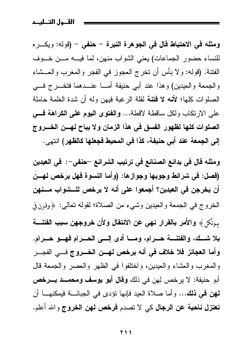 ومثله قال في بدائع الصنائع في ترتيب الشرائع -حنفي-: في العيدين (فصل: في شرائط وجوبها وجوازها: (وأما النسوة فهل يرخص لهن أن يخرجن في العيدين؟ أجمعوا على أنه لا يرخص للشواب منهن الخروج في الجمعة والعيدين وشيء من الصلاة؛ لقوله تعالى: {وقرن في بيوتكن} والأمر بالقرار نهي عن الانتقال ولأن خروجهن سبب الفتنة بلا شك، والفتنة حرام، وما أدى إلى الحرام فهو حرام.