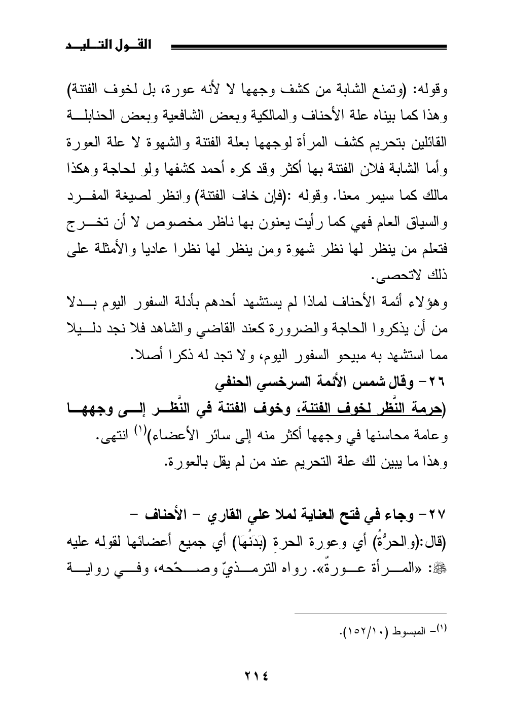وقوله: (وتمنع الشابة من كشف وجهها لا لأنه عورة، بل لخوف الفتنة) وهذا كما بيناه علة الأحناف والمالكية وبعض الشافعية وبعض الحنابلة القائلين بتحريم كشف المرأة لوجهها بعلة الفتنة والشهوة لا علة العورة وأما الشابة فلان الفتنة بها أكثر وقد كره أحمد كشفها ولو لحاجة وهكذا مالك كما سيمر معنا. وقوله: (فإن خاف الفتنة) وانظر لصيغة المفرد والسياق العام فهي كما رأيت يعنون بها ناظر مخصوص لا أن تخرج فتعلم من ينظر لها نظر شهوة ومن ينظر لها نظرا عاديا والأمثلة على ذلك لاتحصى.