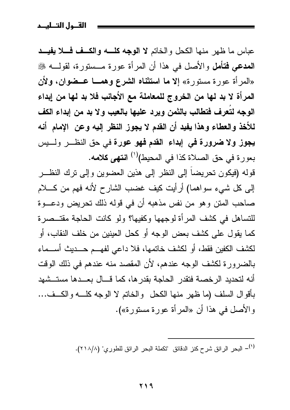 قوله (فيكون تحريضاً إلى النظر إلى هذين العضوين وإلى ترك النظر إلى كل شيء سواهما) أرأيت كيف غضب الشارح لأنه فهم من كلام صاحب المتن وهو من نفس مذهبه أن في قوله ذلك تحريض ودعوة للتساهل في كشف المرأة لوجهها وكفيها؟ ولو كانت الحاجة مقتصرة كما يقول على كشف بعض الوجه أو كحل العينين من خلف النقاب، أو لكشف الكفين فقط، أو لكشف خاتمها، فلا داعي لفهم حديث أسماء بالضرورة لكشف الوجه عندهم، لأن المقصد منه عندهم في ذلك الوقت أنه لتحديد الرخصة فتقدر الحاجة بقدرها، كما قال بعدها مستشهد بأقوال السلف (ما ظهر منها الكحل والخاتم لا الوجه كله والكف ... والأصل في هذا أن «المرأة عورة مستورة»).