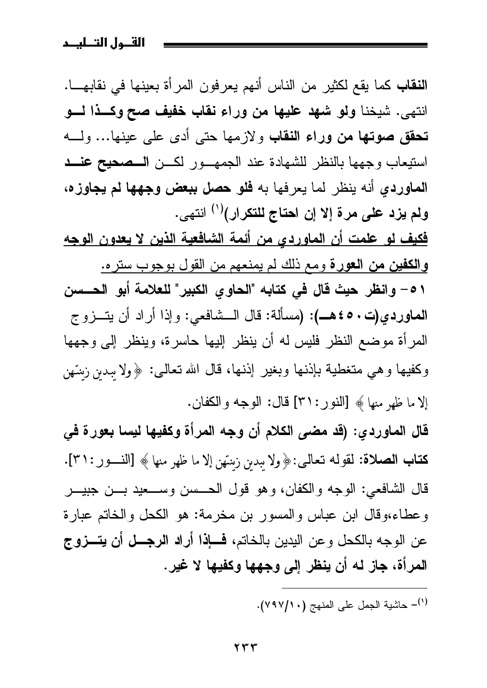 51 - وانظر حيث قال في كتابه "الحاوي الكبير" للعلامة أبو الحسن الماوردي (ت 450 هـ): (مسألة: قال الشافعي: وإذا أراد أن يتزوج المرأة موضع النظر فليس له أن ينظر إليها حاسرة، وينظر إلى وجهها وكفيها وهي متغطية بإذنها وبغير إذنها، قال الله تعالى: {ولا يبدين زينتهن إلا ما ظهر منها} [النور: 31] قال: الوجه والكفان.