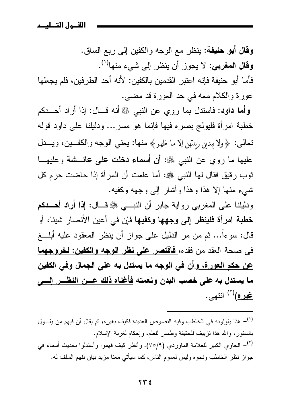 (¬2) الحاوي الكبير للعلامة الماوردي (9/ 75). وأنظر كيف فهموا وأستدلوا بحديث أسماء في جواز نظر الخاطب ونحوه وليس لعموم الناس، كما سيأتي معنا مزيد بيان لفهم السلف له.