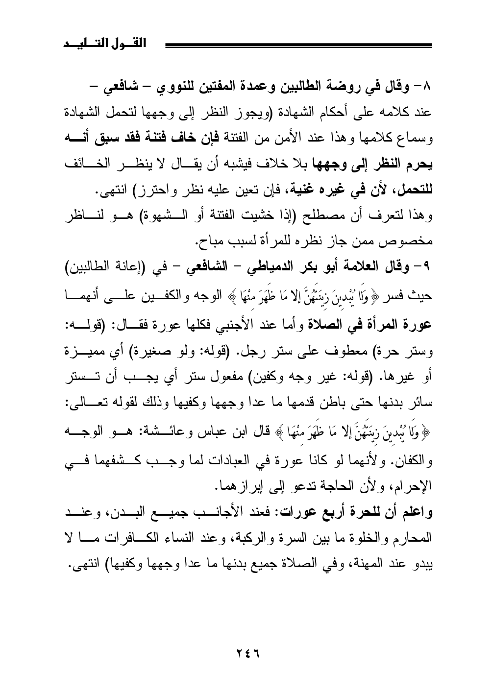 9 - وقال العلامة أبو بكر الدمياطي - الشافعي - في (إعانة الطالبين) حيث فسر {وَلَا يُبْدِينَ زِينَتَهُنَّ إلا مَا ظَهَرَ مِنْهَا} الوجه والكفين على أنهما عورة المرأة في الصلاة وأما عند الأجنبي فكلها عورة فقال: (قوله: وستر حرة) معطوف على ستر رجل. (قوله: ولو صغيرة) أي مميزة أو غيرها. (قوله: غير وجه وكفين) مفعول ستر أي يجب أن تستر سائر بدنها حتى باطن قدمها ما عدا وجهها وكفيها وذلك لقوله تعالى: {وَلَا يُبْدِينَ زِينَتَهُنَّ إلا مَا ظَهَرَ مِنْهَا} قال ابن عباس وعائشة: هو الوجه والكفان. ولأنهما لو كانا عورة في العبادات لما وجب كشفهما في الإحرام، ولأن الحاجة تدعو إلى إبرازهما.