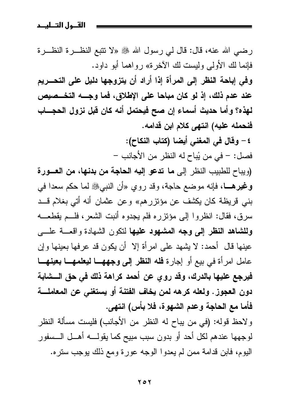 ولاحظ قوله: (في من يباح له النظر من الأجانب) فليست مسألة النظر لوجهها عندهم لكل أحد أو بدون سبب مبيح كما يقوله أهل السفور اليوم، فابن قدامة ممن لم يعدوا الوجه عورة ومع ذلك يوجب ستره.