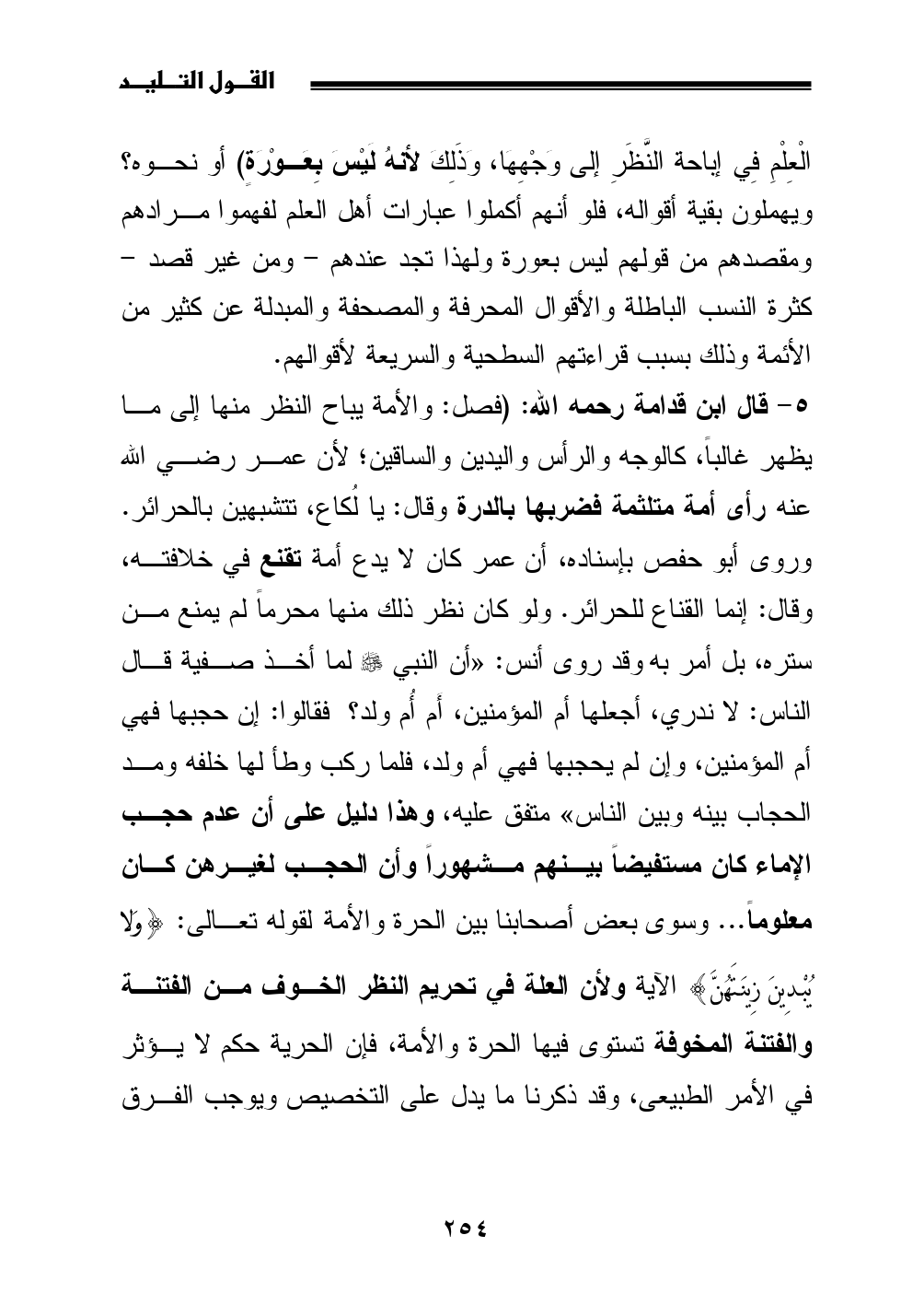 5 - قال ابن قدامة رحمه الله: (فصل: والأمة يباح النظر منها إلى ما يظهر غالباً، كالوجه والرأس واليدين والساقين؛ لأن عمر رضي الله عنه رأى أمة متلثمة فضربها بالدرة وقال: يا لُكاع، تتشبهين بالحرائر. وروى أبو حفص بإسناده، أن عمر كان لا يدع أمة تقنع في خلافته، وقال: إنما القناع للحرائر. ولو كان نظر ذلك منها محرماً لم يمنع من ستره، بل أمر به وقد روى أنس: «أن النبي - صلى الله عليه وسلم - لما أخذ صفية قال الناس: لا ندري، أجعلها أم المؤمنين، أَم أُم ولد؟ فقالوا: إن حجبها فهي أم المؤمنين، وإن لم يحجبها فهي أم ولد، فلما ركب وطأ لها خلفه ومد الحجاب بينه وبين الناس» متفق عليه، وهذا دليل على أن عدم حجب الإماء كان مستفيضاً بينهم مشهوراً وأن الحجب لغيرهن كان معلوماً ... وسوى بعض أصحابنا بين الحرة والأمة لقوله تعالى: {وَلا يُبْدِينَ زِينَتَهُنَّ} الآية ولأن العلة في تحريم النظر الخوف من الفتنة والفتنة المخوفة تستوى فيها الحرة والأمة , فإن الحرية حكم لا يؤثر في الأمر الطبيعى، وقد ذكرنا ما يدل على التخصيص ويوجب الفرق