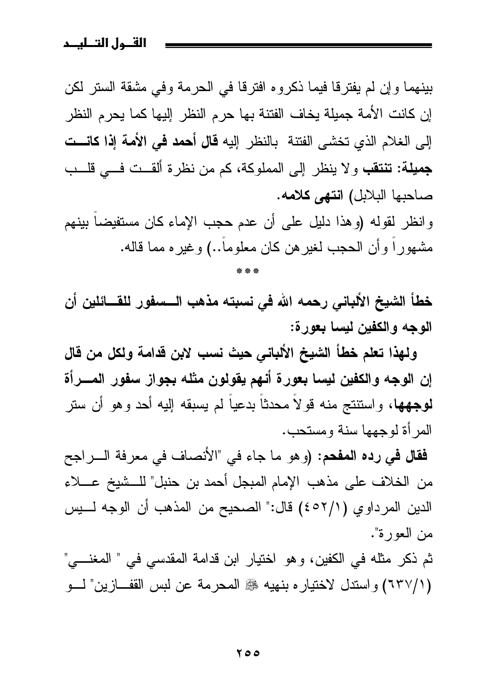 فقال في رده المفحم: (وهو ما جاء في "الأنصاف في معرفة الراجح من الخلاف على مذهب الإمام المبجل أحمد بن حنبل" للشيخ علاء الدين المرداوي (1/ 452) قال: " الصحيح من المذهب أن الوجه ليس من العورة".