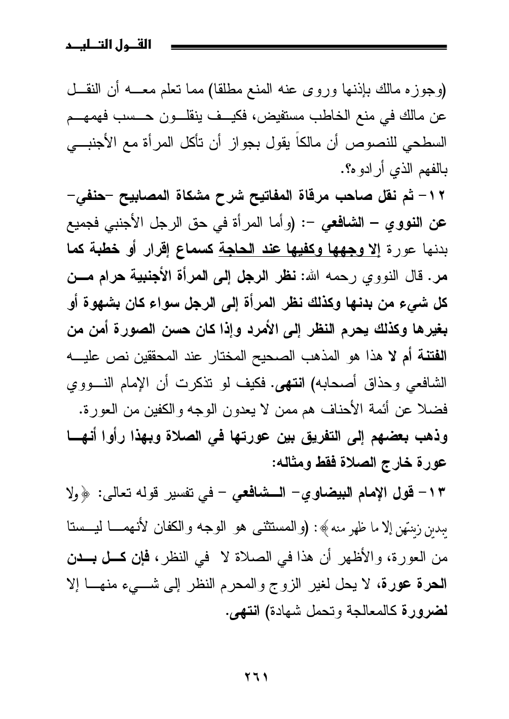 13 - قول الإمام البيضاوي- الشافعي - في تفسير قوله تعالى: {ولا يبدين زينتهن إلا ما ظهر منه}: (والمستثنى هو الوجه والكفان لأنهما ليستا من العورة، والأظهر أن هذا في الصلاة لا في النظر، فإن كل بدن الحرة عورة، لا يحل لغير الزوج والمحرم النظر إلى شيء منها إلا لضرورة كالمعالجة وتحمل شهادة) انتهى.
