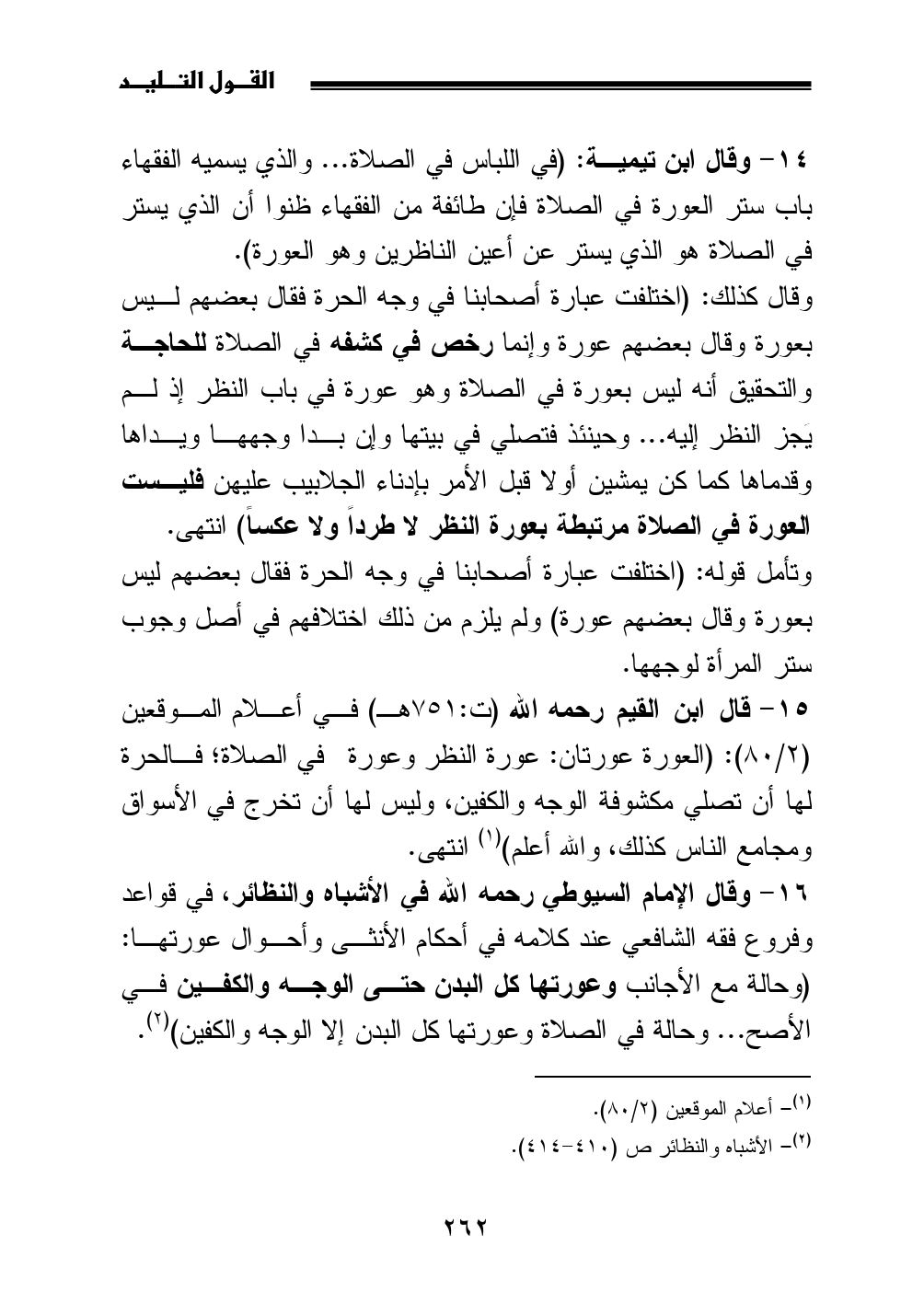 15 - قال ابن القيم رحمه الله (ت: 751 هـ) في أعلام الموقعين (2/ 80): (العورة عورتان: عورة النظر وعورة في الصلاة؛ فالحرة لها أن تصلي مكشوفة الوجه والكفين، وليس لها أن تخرج في الأسواق ومجامع الناس كذلك، والله أعلم) (¬1) انتهى.