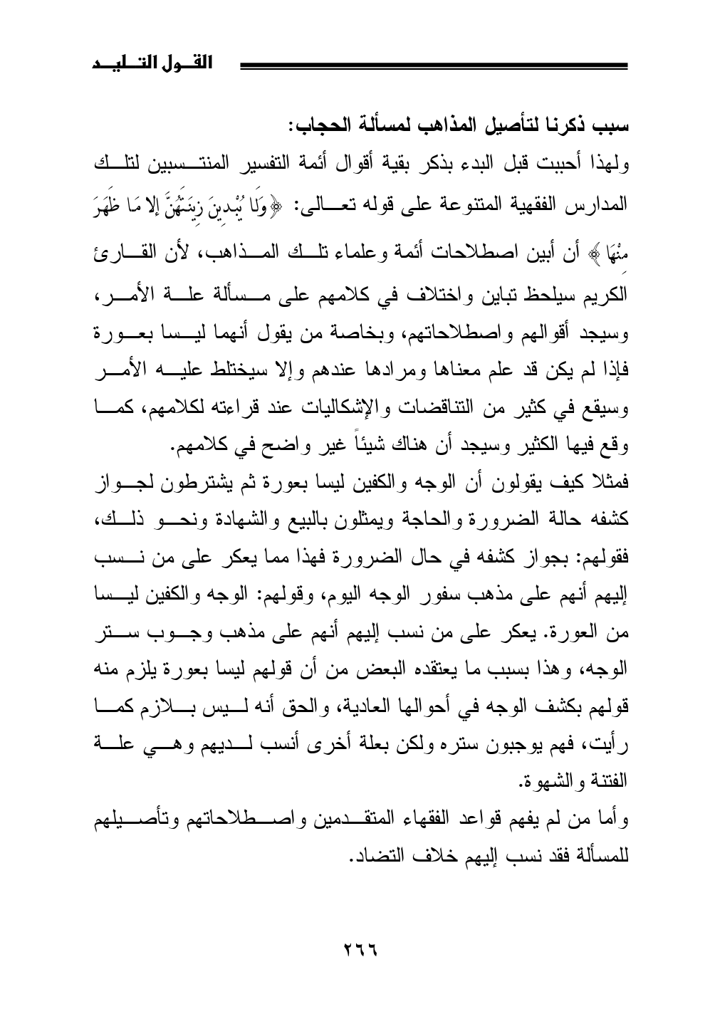 ولهذا أحببت قبل البدء بذكر بقية أقوال أئمة التفسير المنتسبين لتلك المدارس الفقهية المتنوعة على قوله تعالى: {وَلَا يُبْدِينَ زِينَتَهُنَّ إلا مَا ظَهَرَ مِنْهَا} أن أبين اصطلاحات أئمة وعلماء تلك المذاهب، لأن القارئ الكريم سيلحظ تباين واختلاف في كلامهم على مسألة علة الأمر، وسيجد أقوالهم واصطلاحاتهم، وبخاصة من يقول أنهما ليسا بعورة فإذا لم يكن قد علم معناها ومرادها عندهم وإلا سيختلط عليه الأمر وسيقع في كثير من التناقضات والإشكاليات عند قراءته لكلامهم، كما وقع فيها الكثير وسيجد أن هناك شيئاً غير واضح في كلامهم.