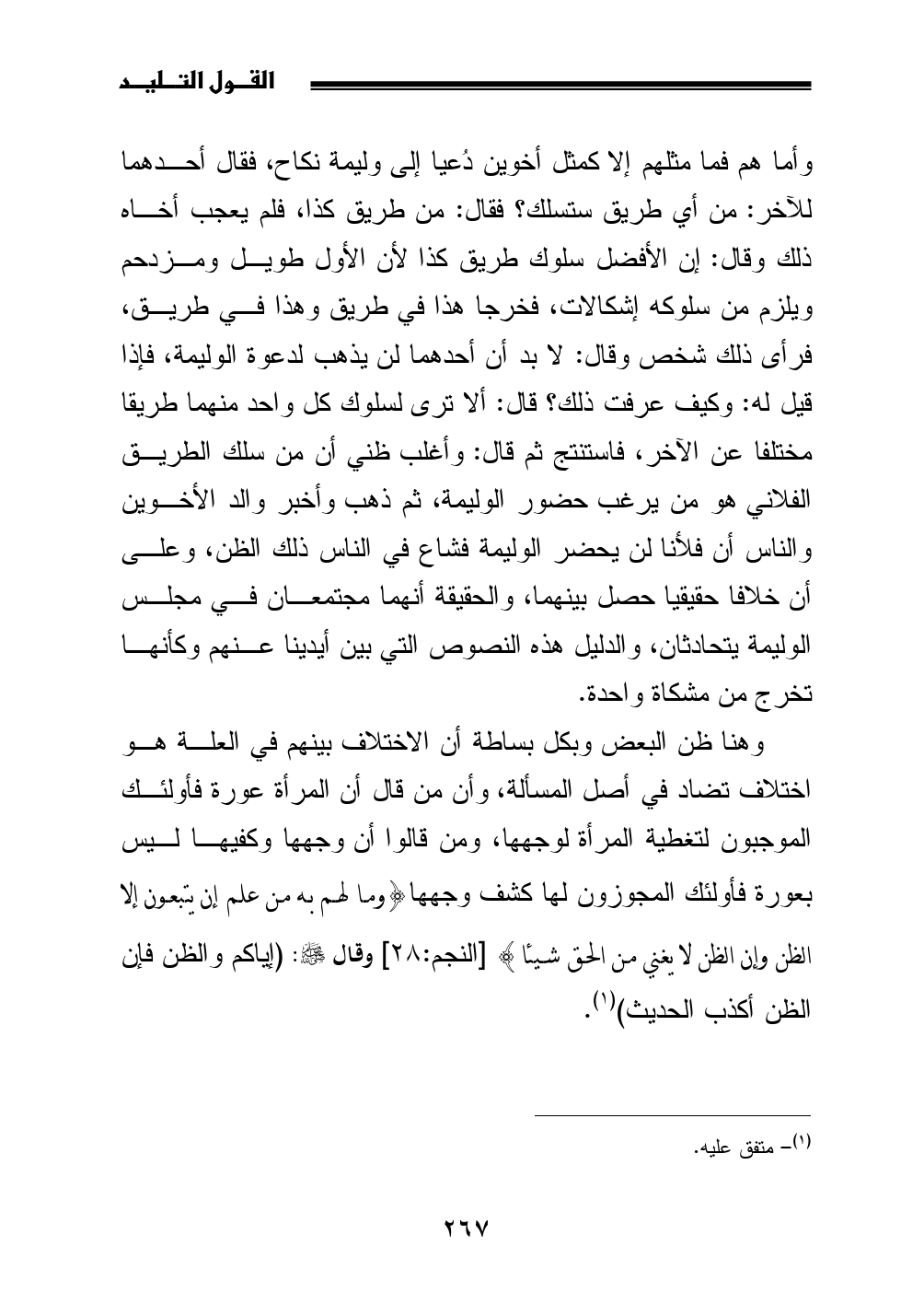 وهنا ظن البعض وبكل بساطة أن الاختلاف بينهم في العلة هو اختلاف تضاد في أصل المسألة، وأن من قال أن المرأة عورة فأولئك الموجبون لتغطية المرأة لوجهها، ومن قالوا أن وجهها وكفيها ليس بعورة فأولئك المجوزون لها كشف وجهها {وما لهم به من علم إن يتبعون إلا الظن وإن الظن لا يغني من الحق شيئا} [النجم: 28] وقال - صلى الله عليه وسلم -: (إياكم والظن فإن الظن أكذب الحديث) (¬1).