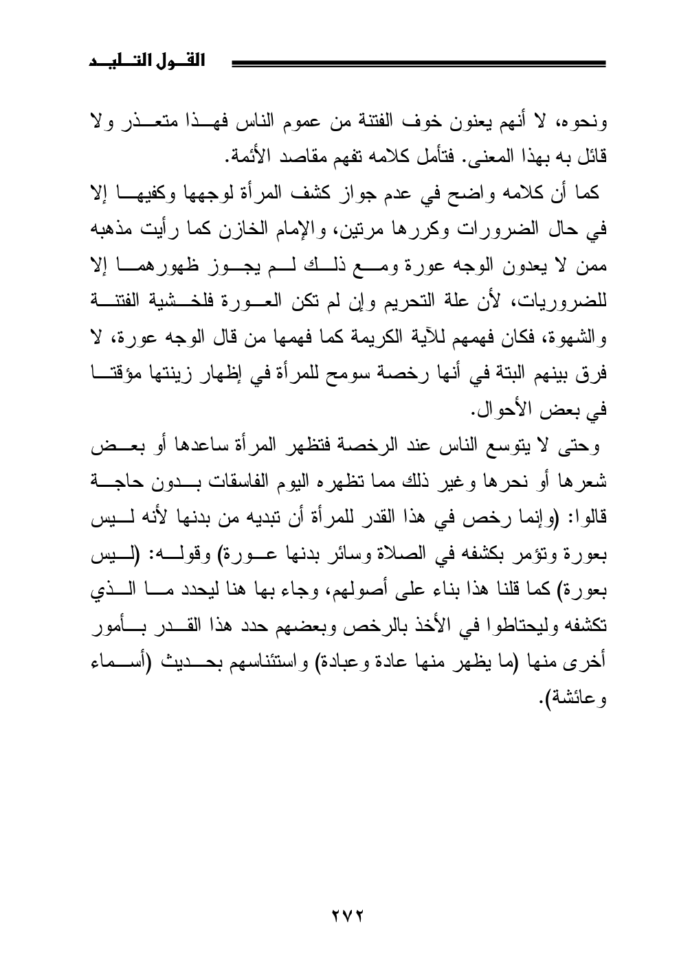 كما أن كلامه واضح في عدم جواز كشف المرأة لوجهها وكفيها إلا في حال الضرورات وكررها مرتين، والإمام الخازن كما رأيت مذهبه ممن لا يعدون الوجه عورة ومع ذلك لم يجوز ظهورهما إلا للضروريات، لأن علة التحريم وإن لم تكن العورة فلخشية الفتنة والشهوة، فكان فهمهم للآية الكريمة كما فهمها من قال الوجه عورة، لا فرق بينهم البتة في أنها رخصة سومح للمرأة في إظهار زينتها مؤقتا في بعض الأحوال.
