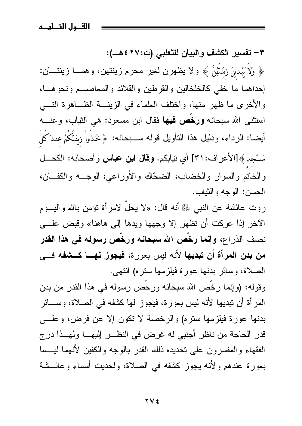 وقوله: (وإنما رخّص الله سبحانه ورخّص رسوله في هذا القدر من بدن المرأة أن تبديها لأنه ليس بعورة، فيجوز لها كشفه في الصلاة، وسائر بدنها عورة فيلزمها ستره) والرخصة لا تكون إلا عن فرض، وعلى قدر الحاجة من ناظر أجنبي له غرض في النظر إليها ولهذا درج الفقهاء والمفسرون على تحديده ذلك القدر بالوجه والكفين لأنهما ليسا بعورة عندهم ولأنه يجوز كشفه في الصلاة، ولحديث أسماء وعائشة