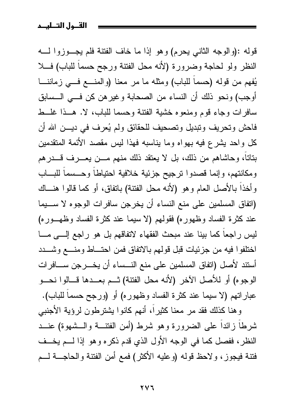 قوله: (والوجه الثاني يحرم) وهو إذا ما خاف الفتنة فلم يجوزوا له النظر ولو لحاجة وضرورة (لأنه محل الفتنة ورجح حسماً للباب) فلا يُفهم من قوله (حسماً للباب) ومثله ما مر معنا (والمنع في زماننا أوجب) ونحو ذلك أن النساء من الصحابة وغيرهن كن في السابق سافرات وجاء قوم ومنعوه خشية الفتنة وحسما للباب، لا. هذا غلط فاحش وتحريف وتبديل وتصحيف للحقائق ولم يُعرف في دين الله أن كل واحد يشرع فيه بهواه وما يناسبه فهذا ليس مقصد الأئمة المتقدمين بتاتاً، وحاشاهم من ذلك، بل لا يعتقد ذلك منهم من يعرف قدرهم ومكانتهم، وإنما قصدوا ترجيح جزئية خلافية احتياطاً وحسماً للباب وأخذاً بالأصل العام وهو (لأنه محل الفتنة) باتفاق، أو كما قالوا هناك (اتفاق المسلمين على منع النساء أن يخرجن سافرات الوجوه لا سيما عند كثرة الفساد وظهوره) فقولهم (لا سيما عند كثرة الفساد وظهوره) ليس راجعاً كما بينا عند مبحث الفقهاء لاتفاقهم بل هو راجع إلى ما اختلفوا فيه من جزئيات قبل قولهم بالاتفاق فمن احتاط ومنع وشدد أستند لأصل (اتفاق المسلمين على منع النساء أن يخرجن سافرات الوجوه) أو للأصل الآخر (لأنه محل الفتنة) ثم بعدها قالوا نحو عباراتهم (لا سيما عند كثرة الفساد وظهوره) أو (ورجح حسماً للباب).