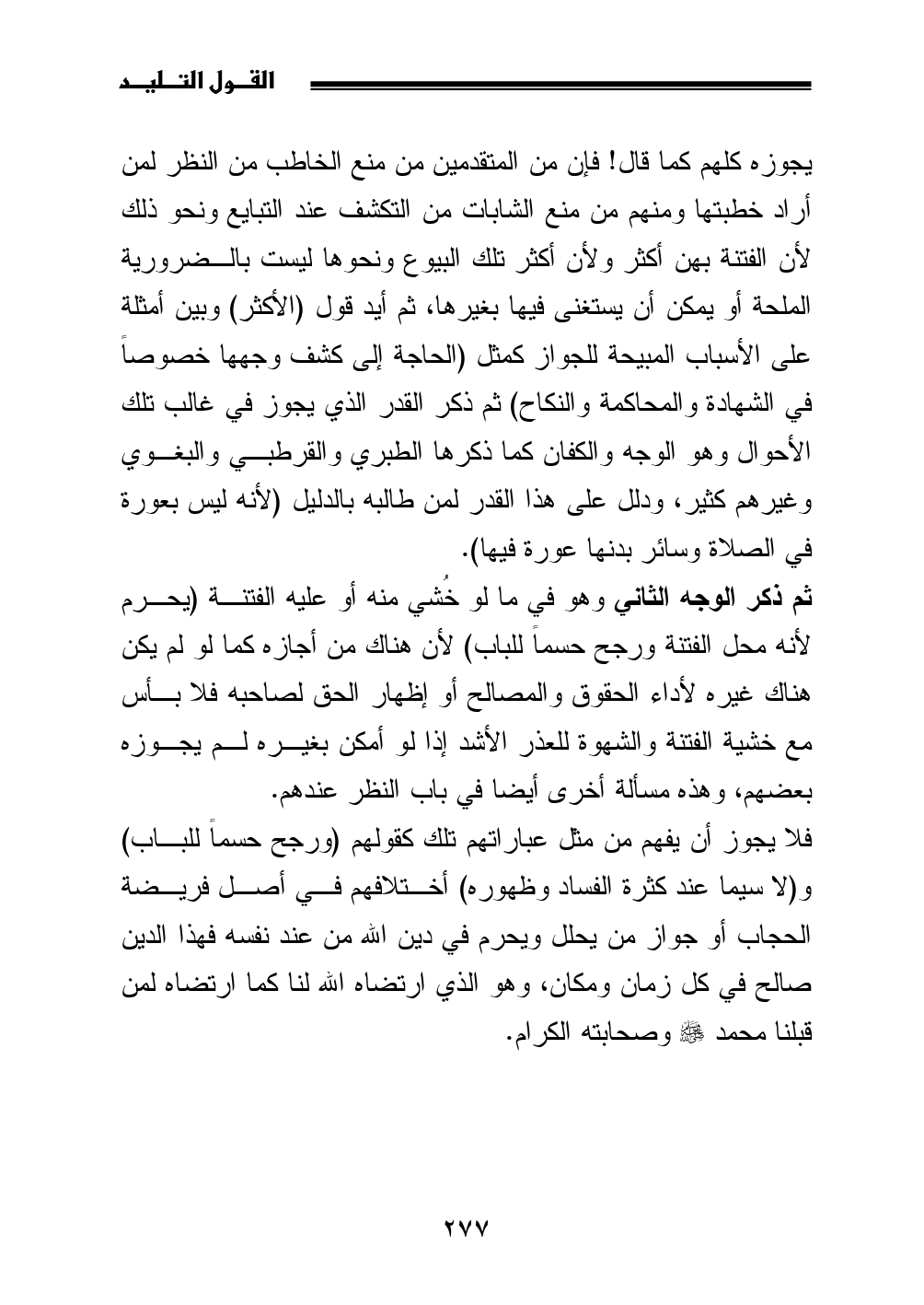 يجوزه كلهم كما قال! فإن من المتقدمين من منع الخاطب من النظر لمن أراد خطبتها ومنهم من منع الشابات من التكشف عند التبايع ونحو ذلك لأن الفتنة بهن أكثر ولأن أكثر تلك البيوع ونحوها ليست بالضرورية الملحة أو يمكن أن يستغنى فيها بغيرها، ثم أيد قول (الأكثر) وبين أمثلة على الأسباب المبيحة للجواز كمثل (الحاجة إلى كشف وجهها خصوصاً في الشهادة والمحاكمة والنكاح) ثم ذكر القدر الذي يجوز في غالب تلك الأحوال وهو الوجه والكفان كما ذكرها الطبري والقرطبي والبغوي وغيرهم كثير، ودلل على هذا القدر لمن طالبه بالدليل (لأنه ليس بعورة في الصلاة وسائر بدنها عورة فيها).