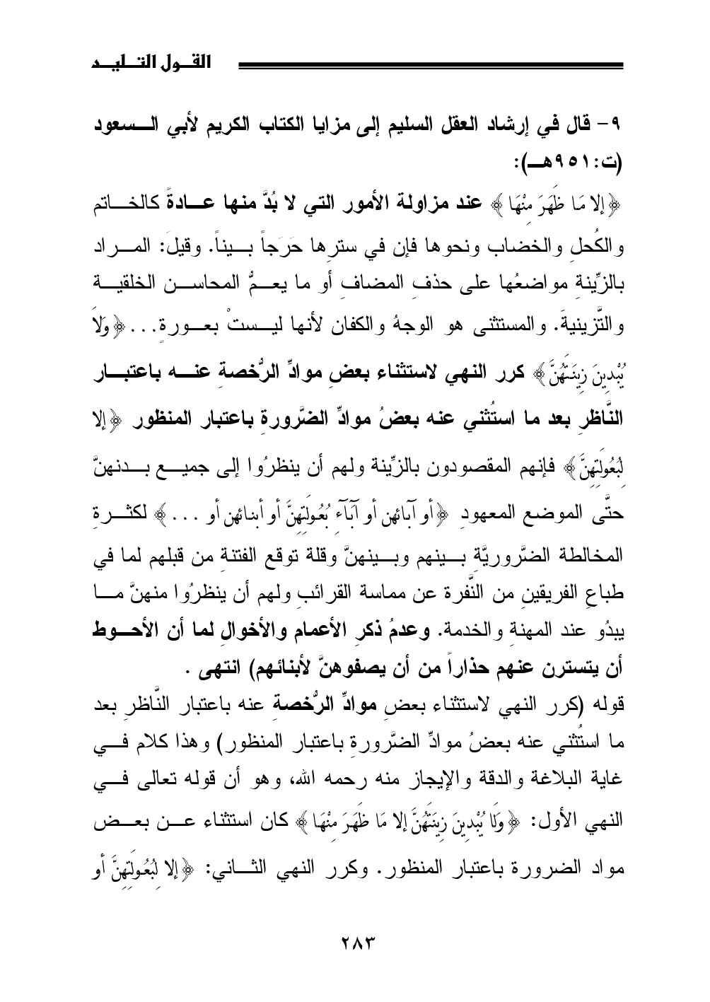 قوله (كرر النهي لاستثناء بعضِ موادِّ الرُّخصةِ عنه باعتبار النَّاظرِ بعد ما استُثني عنه بعضُ موادِّ الضَّرورةِ باعتبار المنظور) وهذا كلام في غاية البلاغة والدقة والإيجاز منه رحمه الله، وهو أن قوله تعالى في النهي الأول: {وَلَا يُبْدِينَ زِينَتَهُنَّ إلا مَا ظَهَرَ مِنْهَا} كان استثناء عن بعض مواد الضرورة باعتبار المنظور. وكرر النهي الثاني: {إلا لِبُعُولَتِهِنَّ أو