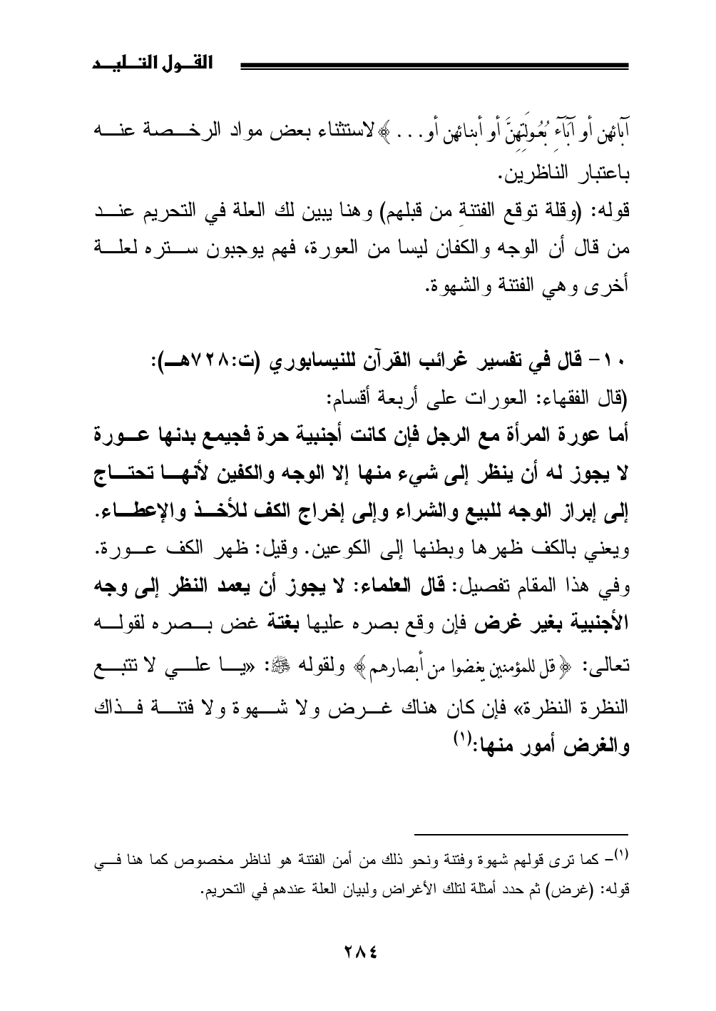 (¬1) كما ترى قولهم شهوة وفتنة ونحو ذلك من أمن الفتنة هو لناظر مخصوص كما هنا في قوله: (غرض) ثم حدد أمثلة لتلك الأغراض ولبيان العلة عندهم في التحريم.