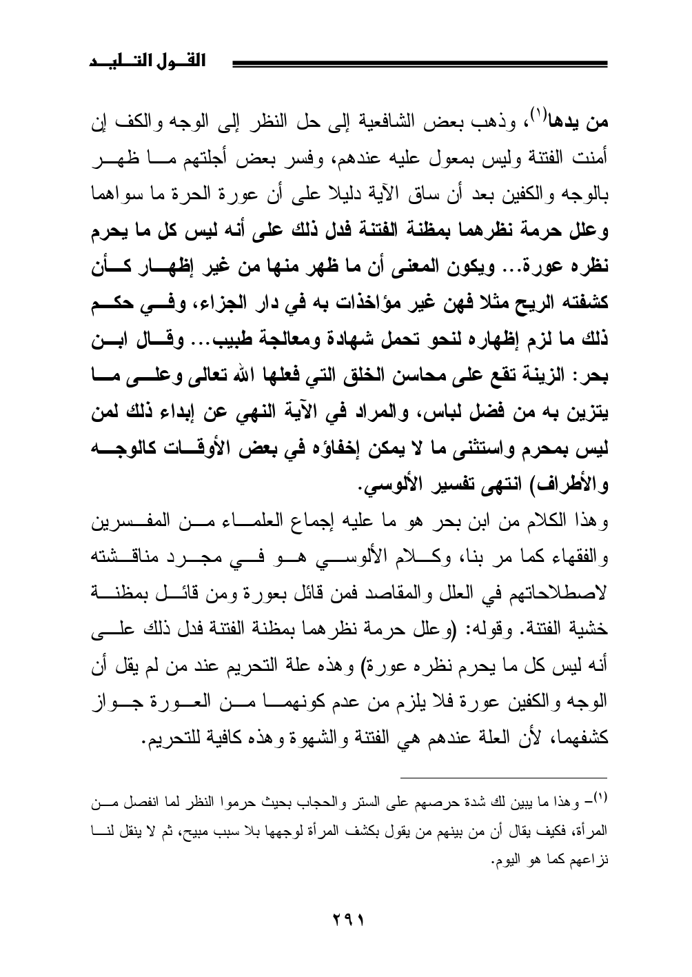 (¬1) وهذا ما يبين لك شدة حرصهم على الستر والحجاب بحيث حرموا النظر لما انفصل من المرأة، فكيف يقال أن من بينهم من يقول بكشف المرأة لوجهها بلا سبب مبيح، ثم لا ينقل لنا نزاعهم كما هو اليوم.