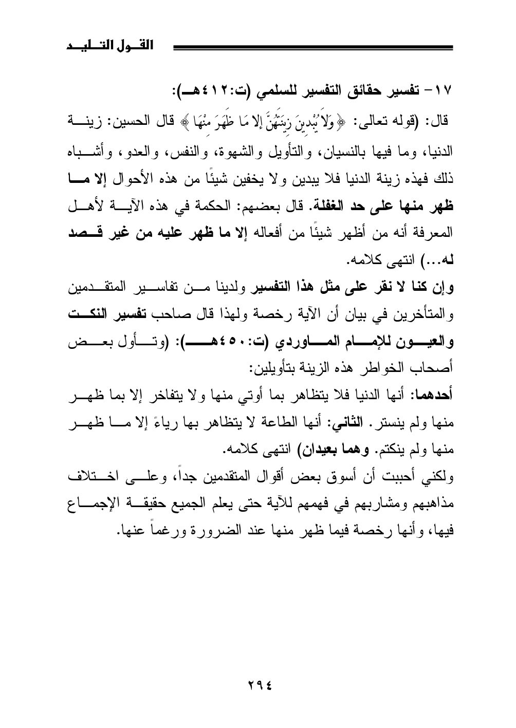 وإن كنا لا نقر على مثل هذا التفسير ولدينا من تفاسير المتقدمين والمتأخرين في بيان أن الآية رخصة ولهذا قال صاحب تفسير النكت والعيون للإمام الماوردي (ت: 450 هـ): (وتأول بعض ... أصحاب الخواطر هذه الزينة بتأويلين: