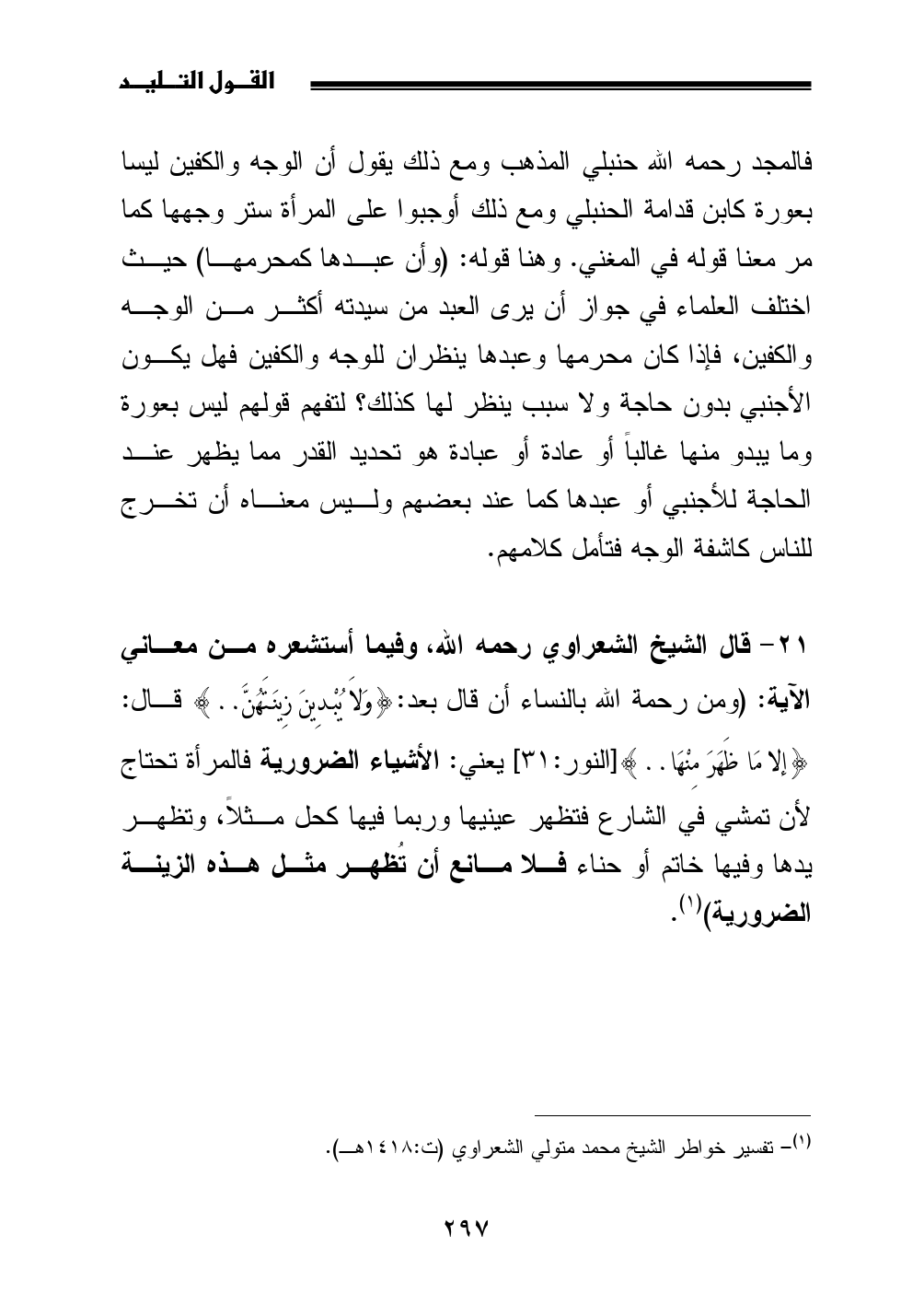 21 - قال الشيخ الشعراوي رحمه الله، وفيما أستشعره من معاني الآية: (ومن رحمة الله بالنساء أن قال بعد: {وَلاَ يُبْدِينَ زِينَتَهُنَّ .. } قال: {إلا مَا ظَهَرَ مِنْهَا .. } [النور: 31] يعني: الأشياء الضرورية فالمرأة تحتاج لأن تمشي في الشارع فتظهر عينيها وربما فيها كحل مثلاً، وتظهر يدها وفيها خاتم أو حناء فلا مانع أن تُظهر مثل هذه الزينة الضرورية) (¬1).