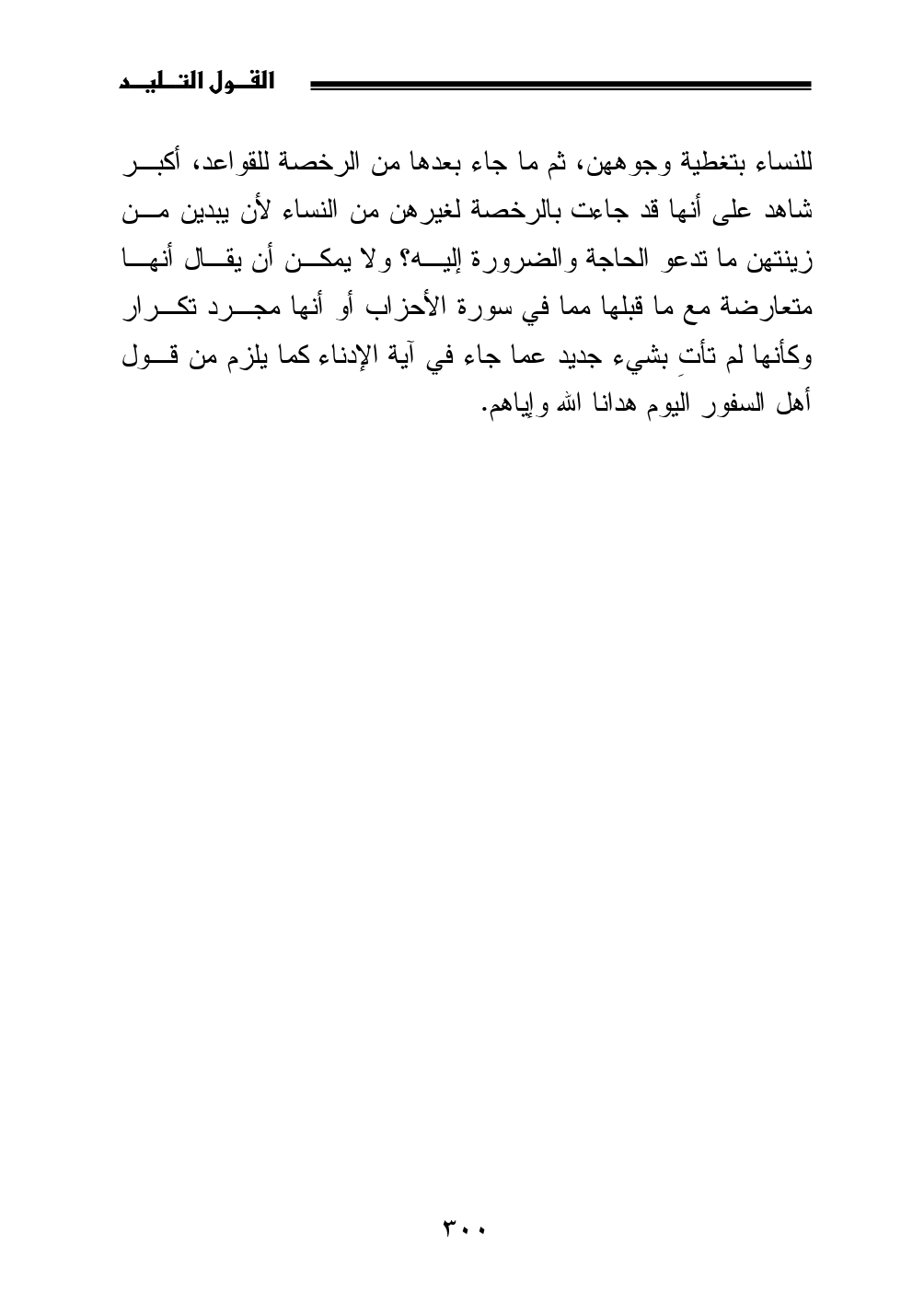 للنساء بتغطية وجوههن، ثم ما جاء بعدها من الرخصة للقواعد، أكبر شاهد على أنها قد جاءت بالرخصة لغيرهن من النساء لأن يبدين من زينتهن ما تدعو الحاجة والضرورة إليه؟ ولا يمكن أن يقال أنها متعارضة مع ما قبلها مما في سورة الأحزاب أو أنها مجرد تكرار وكأنها لم تأتِ بشيء جديد عما جاء في آية الإدناء كما يلزم من قول أهل السفور اليوم هدانا الله وإياهم.