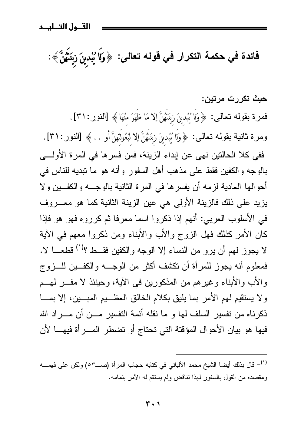 (¬1) قال بذلك أيضا الشيخ محمد الألباني في كتابه حجاب المرأة (صـ 53) ولكن على فهمه ومقصده من القول بالسفور لهذا تناقض ولم يستقم له الأمر بتمامه.