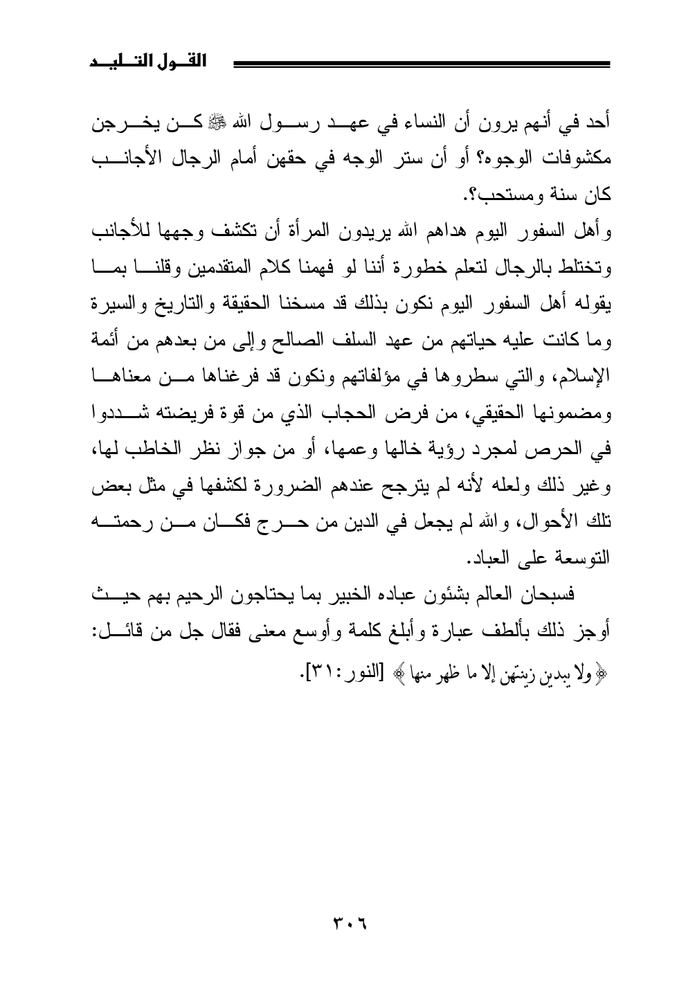 فسبحان العالم بشئون عباده الخبير بما يحتاجون الرحيم بهم حيث أوجز ذلك بألطف عبارة وأبلغ كلمة وأوسع معنى فقال جل من قائل: {ولا يبدين زينتهن إلا ما ظهر منها} [النور: 31].