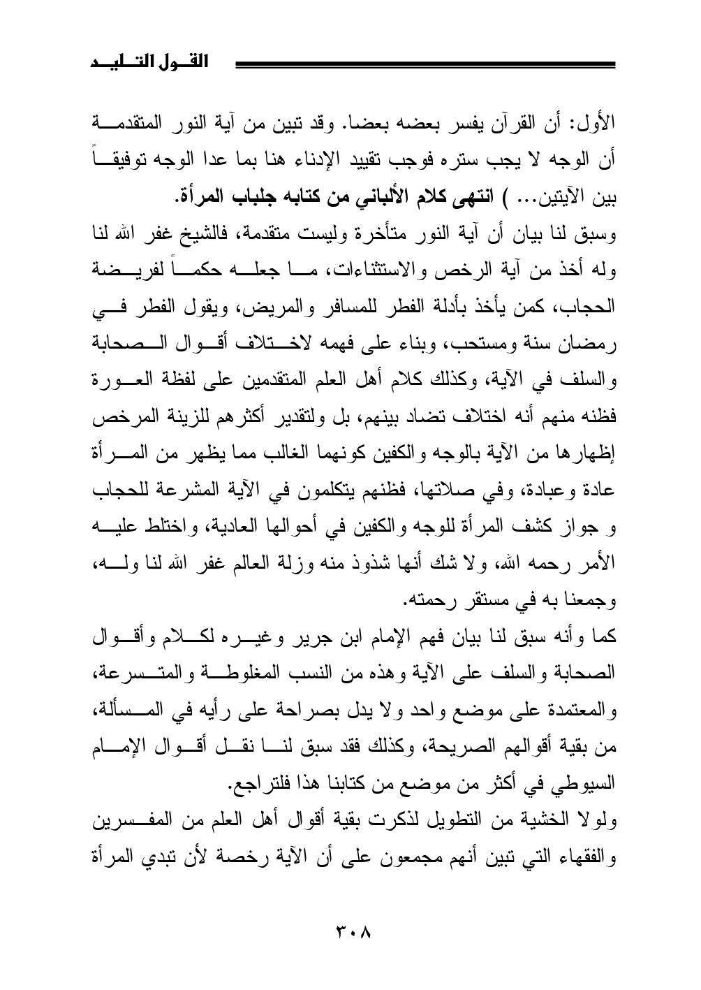 وسبق لنا بيان أن آية النور متأخرة وليست متقدمة، فالشيخ غفر الله لنا وله أخذ من آية الرخص والاستثناءات، ما جعله حكماً لفريضة الحجاب، كمن يأخذ بأدلة الفطر للمسافر والمريض، ويقول الفطر في رمضان سنة ومستحب، وبناء على فهمه لاختلاف أقوال الصحابة والسلف في الآية، وكذلك كلام أهل العلم المتقدمين على لفظة العورة فظنه منهم أنه اختلاف تضاد بينهم، بل ولتقدير أكثرهم للزينة المرخص إظهارها من الآية بالوجه والكفين كونهما الغالب مما يظهر من المرأة عادة وعبادة، وفي صلاتها، فظنهم يتكلمون في الآية المشرعة للحجاب وجواز كشف المرأة للوجه والكفين في أحوالها العادية، واختلط عليه الأمر رحمه الله، ولا شك أنها شذوذ منه وزلة العالم غفر الله لنا وله، وجمعنا به في مستقر رحمته.