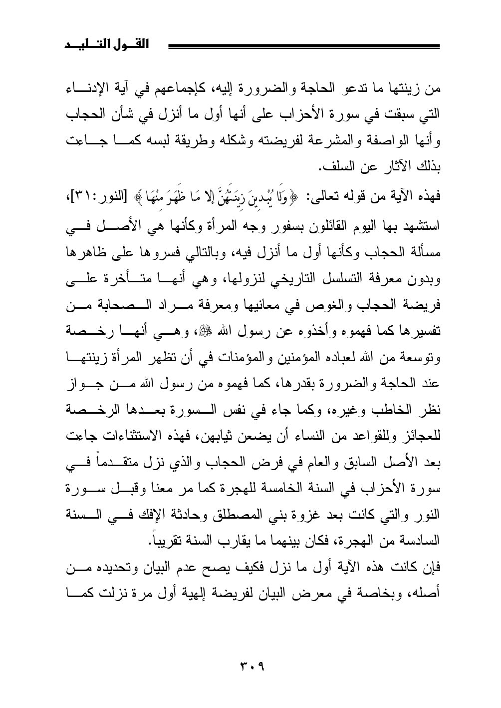 فهذه الآية من قوله تعالى: {وَلَا يُبْدِينَ زِينَتَهُنَّ إلا مَا ظَهَرَ مِنْهَا} [النور: 31]، استشهد بها اليوم القائلون بسفور وجه المرأة وكأنها هي الأصل في مسألة الحجاب وكأنها أول ما أنزل فيه، وبالتالي فسروها على ظاهرها وبدون معرفة التسلسل التاريخي لنزولها، وهي أنها متأخرة على فريضة الحجاب والغوص في معانيها ومعرفة مراد الصحابة من تفسيرها كما فهموه وأخذوه عن رسول الله - صلى الله عليه وسلم -، وهي أنها رخصة وتوسعة من الله لعباده المؤمنين والمؤمنات في أن تظهر المرأة زينتها عند الحاجة والضرورة بقدرها، كما فهموه من رسول الله من جواز نظر الخاطب وغيره، وكما جاء في نفس السورة بعدها الرخصة للعجائز وللقواعد من النساء أن يضعن ثيابهن، فهذه الاستثناءات جاءت بعد الأصل السابق والعام في فرض الحجاب والذي نزل متقدماً في سورة الأحزاب في السنة الخامسة للهجرة كما مر معنا وقبل سورة النور والتي كانت بعد غزوة بني المصطلق وحادثة الإفك في السنة السادسة من الهجرة، فكان بينهما ما يقارب السنة تقريباً.