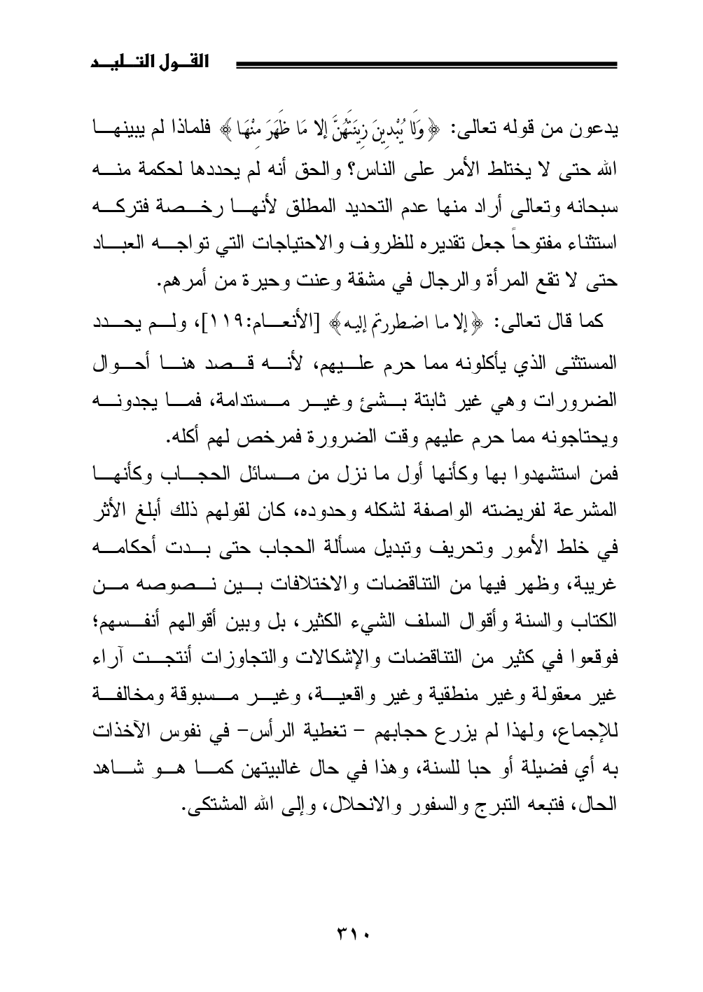 يدعون من قوله تعالى: {وَلَا يُبْدِينَ زِينَتَهُنَّ إلا مَا ظَهَرَ مِنْهَا} فلماذا لم يبينها الله حتى لا يختلط الأمر على الناس؟ والحق أنه لم يحددها لحكمة منه سبحانه وتعالى أراد منها عدم التحديد المطلق لأنها رخصة فتركه استثناء مفتوحاً جعل تقديره للظروف والاحتياجات التي تواجه العباد حتى لا تقع المرأة والرجال في مشقة وعنت وحيرة من أمرهم.