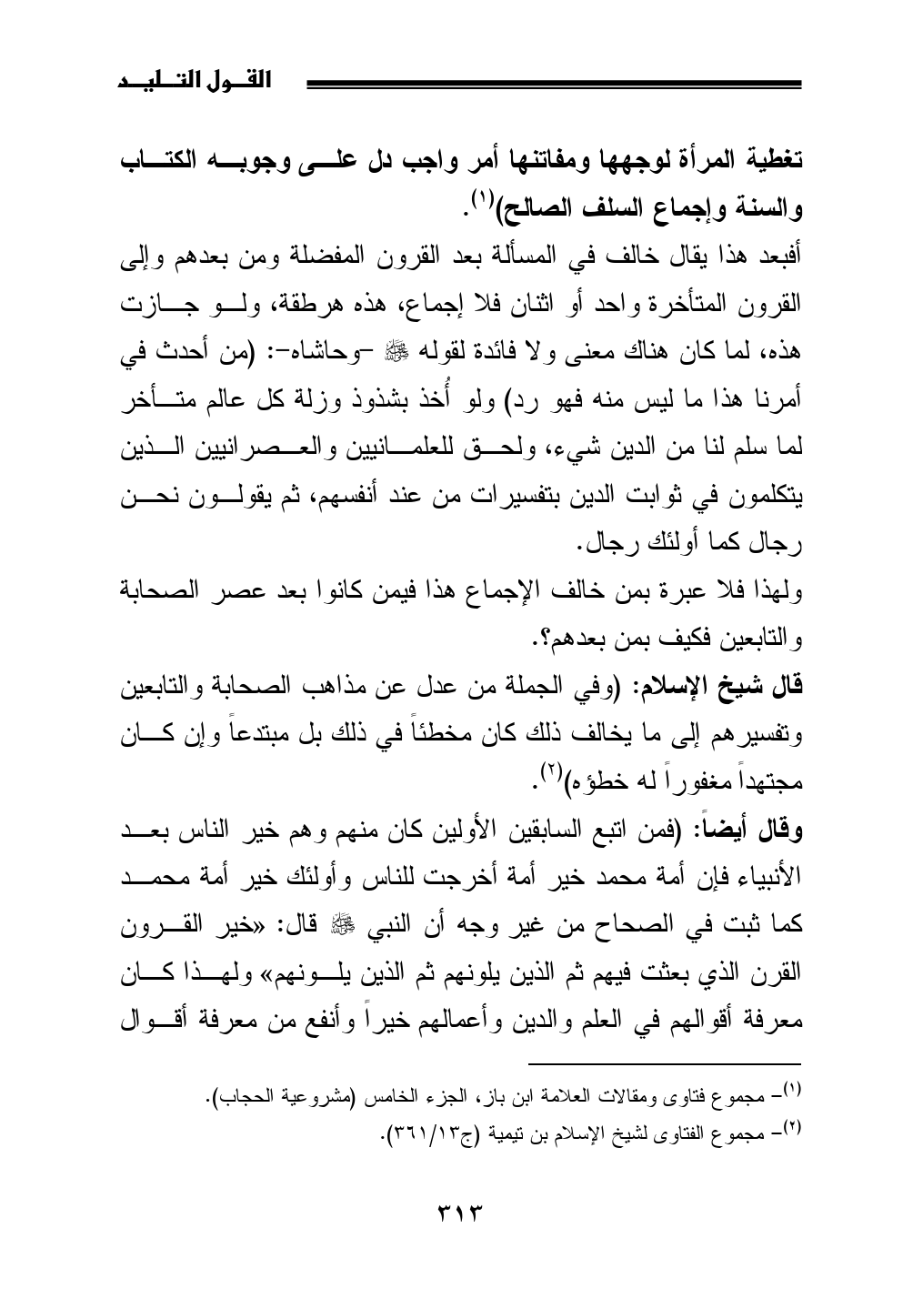 تغطية المرأة لوجهها ومفاتنها أمر واجب دل على وجوبه الكتاب والسنة وإجماع السلف الصالح) (¬1).