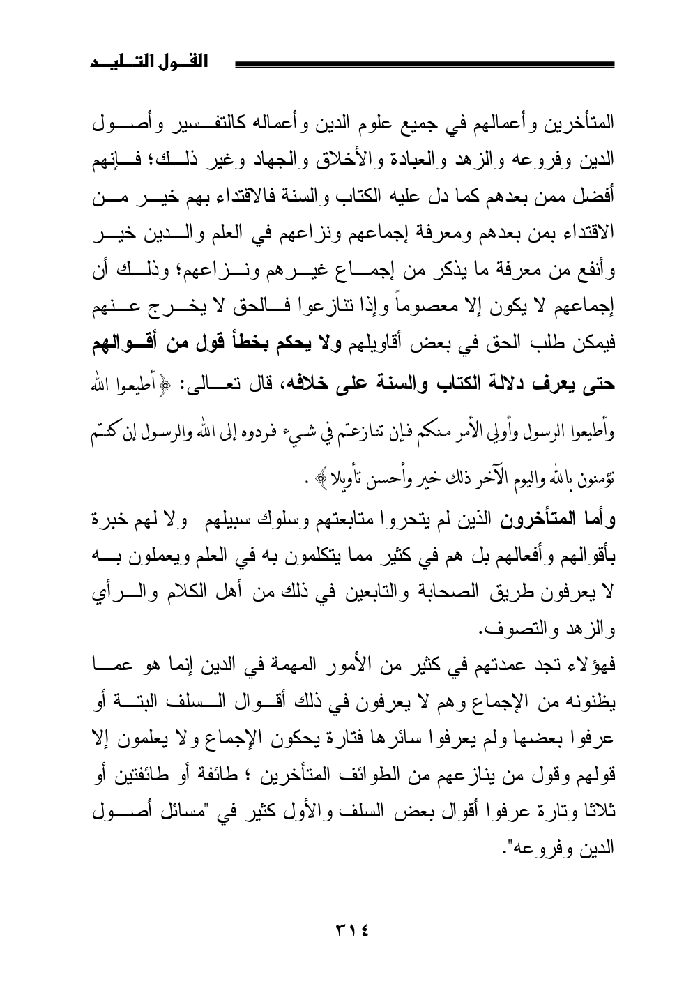 المتأخرين وأعمالهم في جميع علوم الدين وأعماله كالتفسير وأصول الدين وفروعه والزهد والعبادة والأخلاق والجهاد وغير ذلك; فإنهم أفضل ممن بعدهم كما دل عليه الكتاب والسنة فالاقتداء بهم خير من الاقتداء بمن بعدهم ومعرفة إجماعهم ونزاعهم في العلم والدين خير وأنفع من معرفة ما يذكر من إجماع غيرهم ونزاعهم؛ وذلك أن إجماعهم لا يكون إلا معصوماً وإذا تنازعوا فالحق لا يخرج عنهم فيمكن طلب الحق في بعض أقاويلهم ولا يحكم بخطأ قول من أقوالهم حتى يعرف دلالة الكتاب والسنة على خلافه، قال تعالى: {أطيعوا الله وأطيعوا الرسول وأولي الأمر منكم فإن تنازعتم في شيء فردوه إلى الله والرسول إن كنتم تؤمنون بالله واليوم الآخر ذلك خير وأحسن تأويلا}.