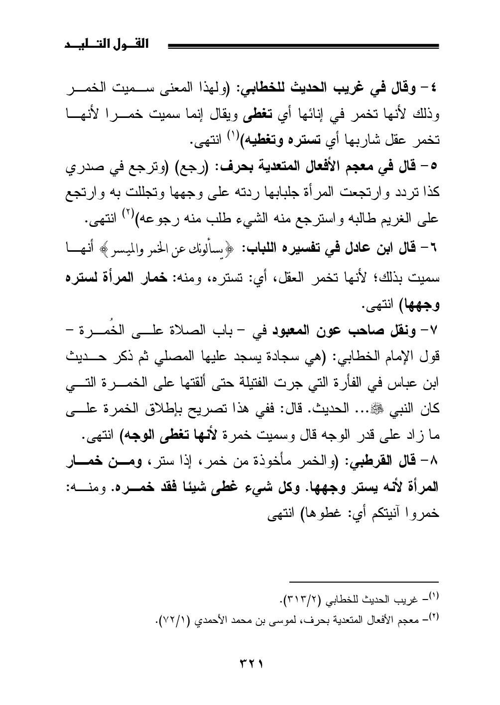 8 - قال القرطبي: (والخمر مأخوذة من خمر، إذا ستر، ومن خمار المرأة لأنه يستر وجهها. وكل شيء غطى شيئا فقد خمره. ومنه: خمروا آنيتكم أي: غطوها) انتهى
