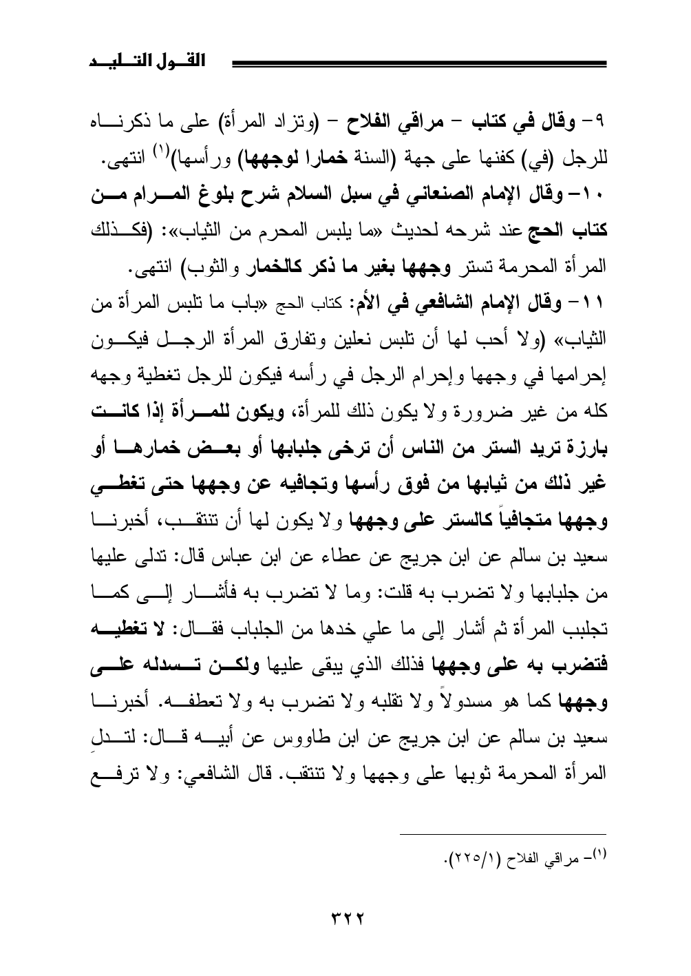 10 - وقال الإمام الصنعاني في سبل السلام شرح بلوغ المرام من كتاب الحج عند شرحه لحديث «ما يلبس المحرم من الثياب»: (فكذلك المرأة المحرمة تستر وجهها بغير ما ذكر كالخمار والثوب) انتهى.